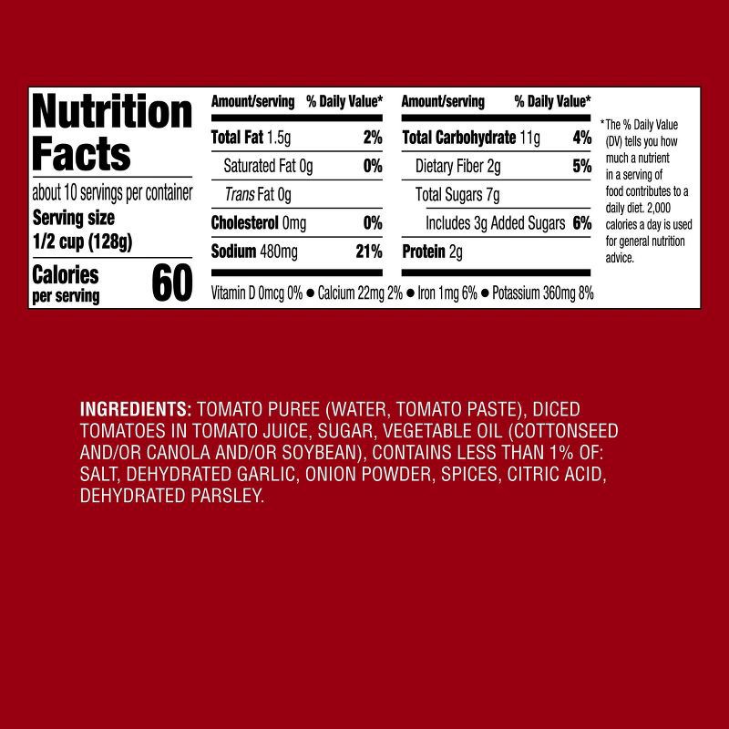 TOMATO PUREE (WATER, TOMATO PASTE), DICED TOMATOES IN TOMATO JUICE, SUGAR, VEG- ETABLE OIL (COTTONSEED AND/OR CANOLA AND/OR SOYBEAN), CONTAINS LESS THAN 1% OF: SALT, DEHY- DRATED GARLIC, ONION POWDER,…
