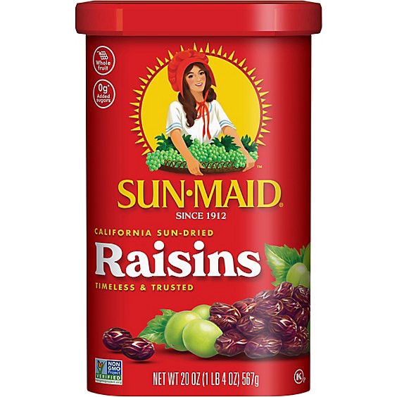 Sun-Maid California Sun-Dried Raisins - Made with nothing but grapes and California sunshine, Sun-Maid Raisins'' timeless and trusted goodness has been a healthy snack for kids and grown-up kids alike…