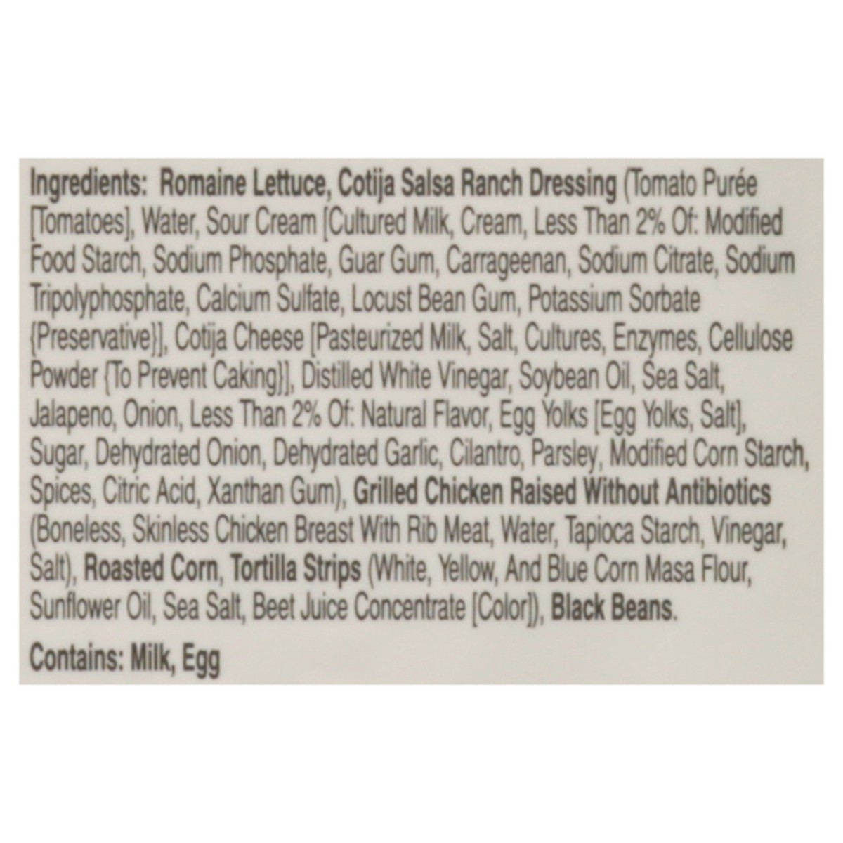 Romaine Lettuce, Cotija Salsa Ranch Dressing (Tomato Puree [Tomatoes], Water, Sour Cream [Cultured Milk, Cream, Less than 2% of: Modified Food Starch, Sodium Phosphate, Guar Gum, Carrageenan, Sodium C…