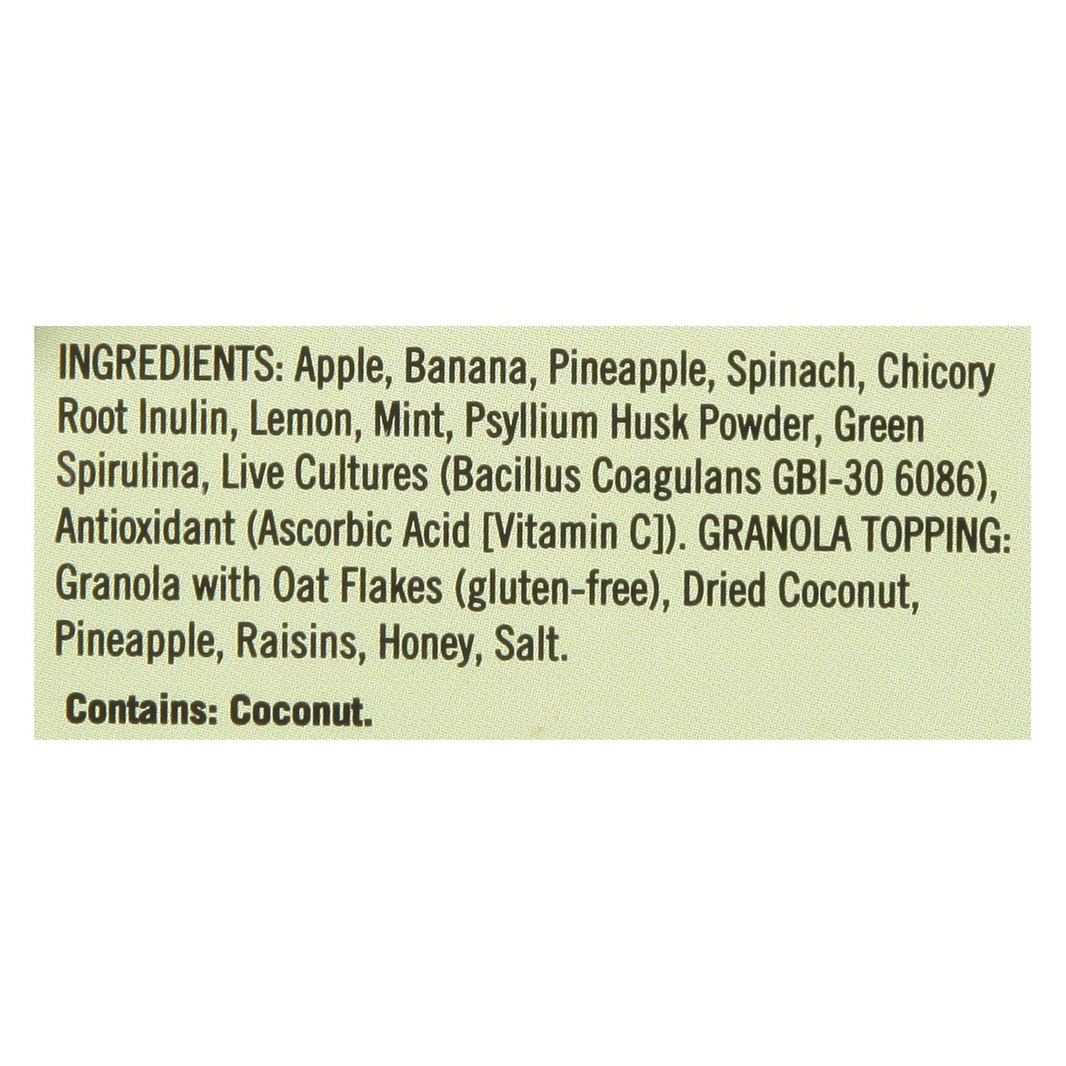 Apple, Banana, Pineapple, Spinach, Chicory Root Inulin, Lemon, Mint, Psyllium Husk Powder, Green Spirulina, Live Cultures (Bacillus Coagulans GBI-30 6086), Antioxidant (Ascorbic Acid [Vitamin C]). Gra…