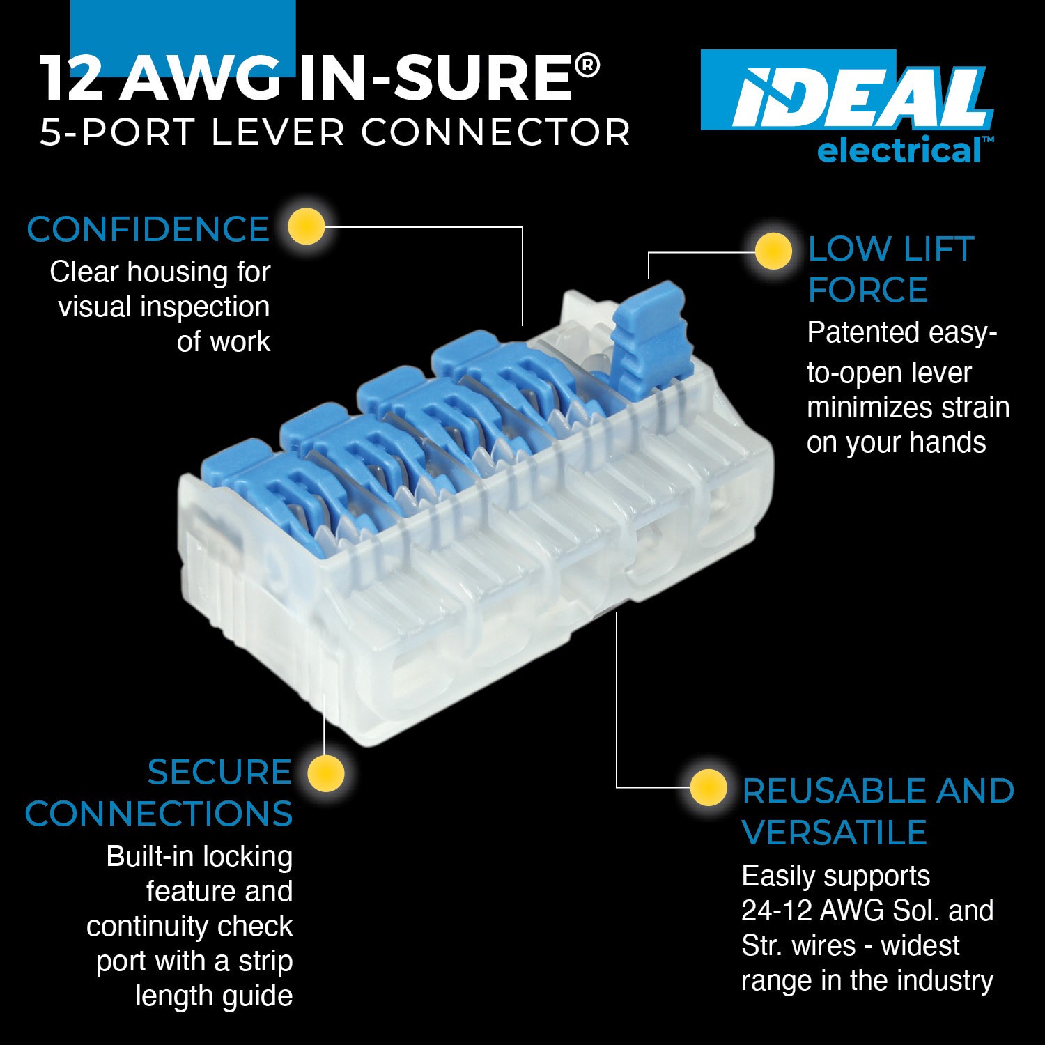 CONVENIENT LEVER DESIGN: Levers are positioned on the opposite side of the wire port. REUSABLE WIRE RANGE: Supports 12 AWG to 24 AWG solid and stranded wires. VOLTAGE AND TEMPERATURE: Maximum rated vo…