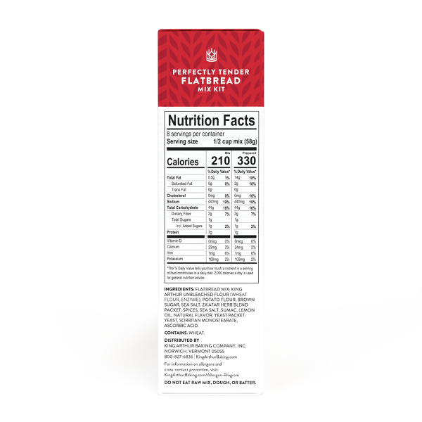 Flatbread Mix: King Arthur Unbleached Flour (Wheat Flour, Enzyme), Potato Flour, Brown Sugar, Sea Salt, Za'atar Herb Blend Packet: Spices, Sea Salt, Sumac, Lemon Oil, Natural Flavor, Yeast Packet: Yea…