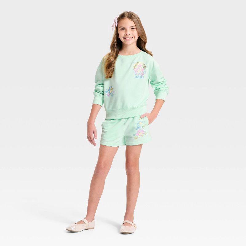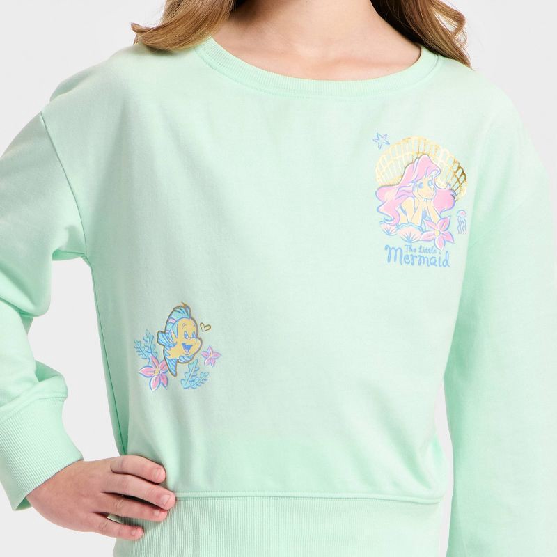 Disney Princess Girls' Disney Little Mermaid Front and Back Graphic French Terry Fleece Wide Neck Sweatshirt - Light Green XS