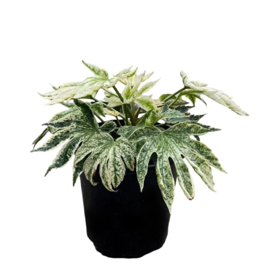 Dramatic shiny green palmate leaves have heavy silver to white web-like speckling. In winter produces 15-inch panicles of creamy-white flowers followed by large black berries. Has somewhat erect stems…