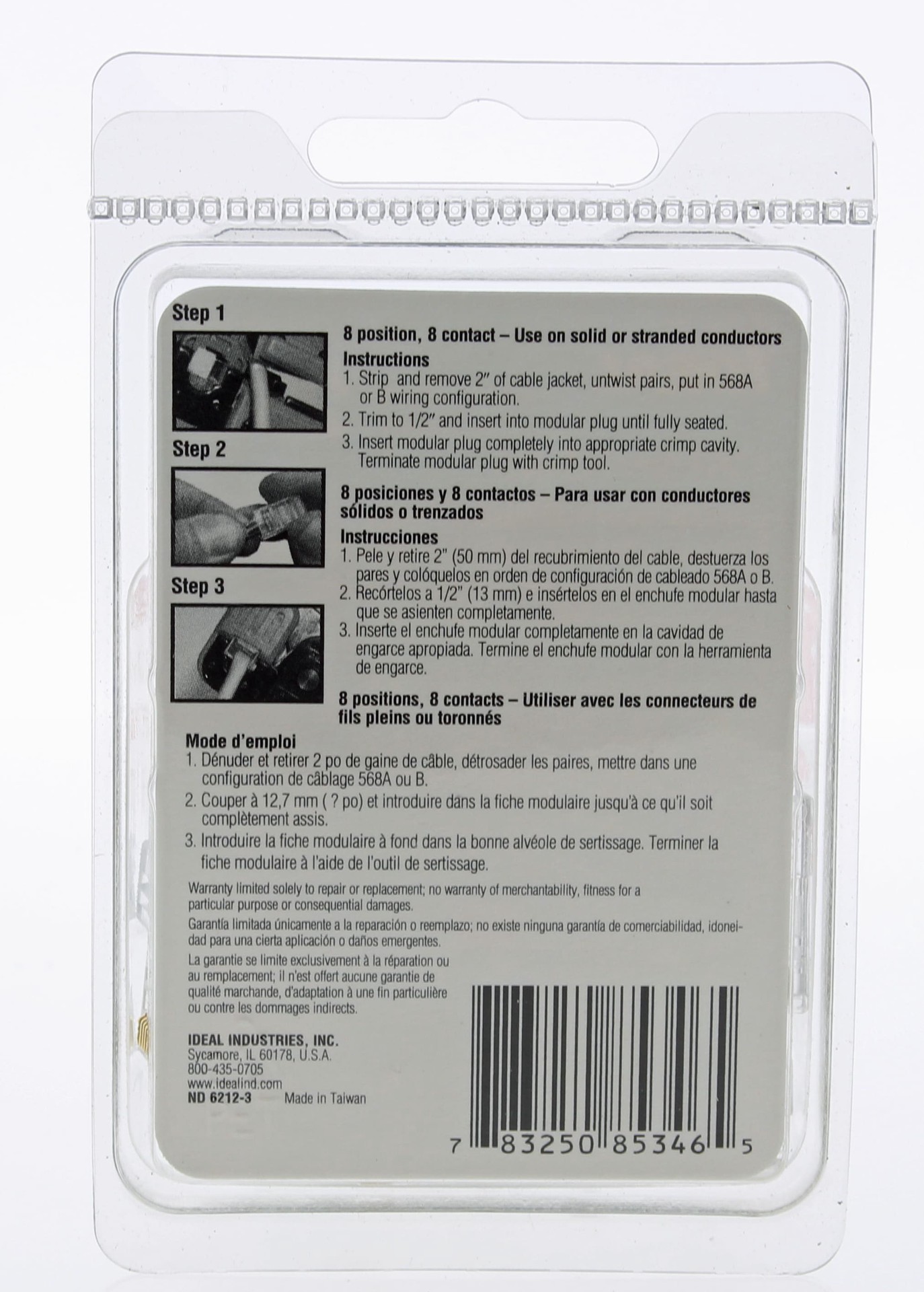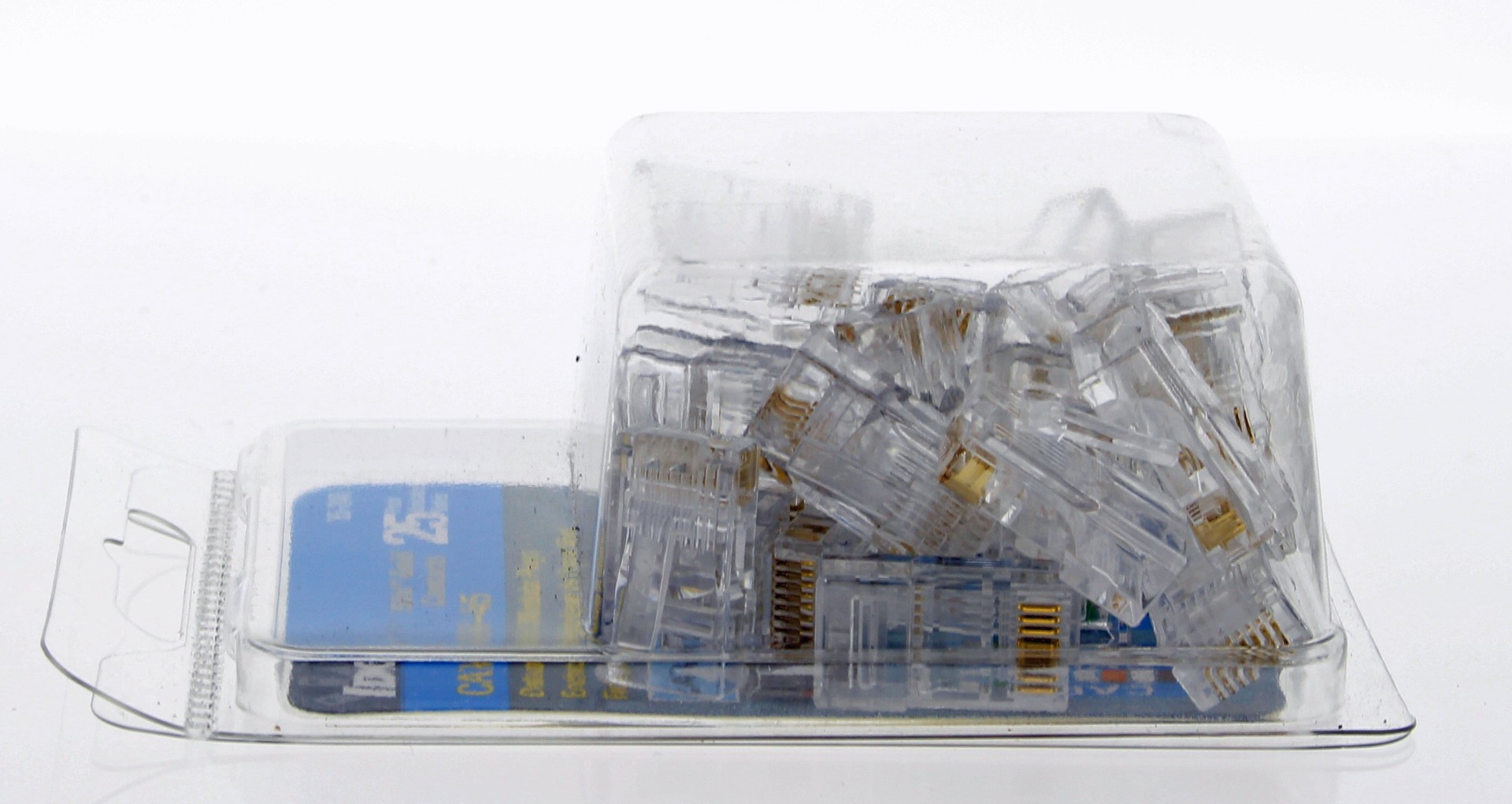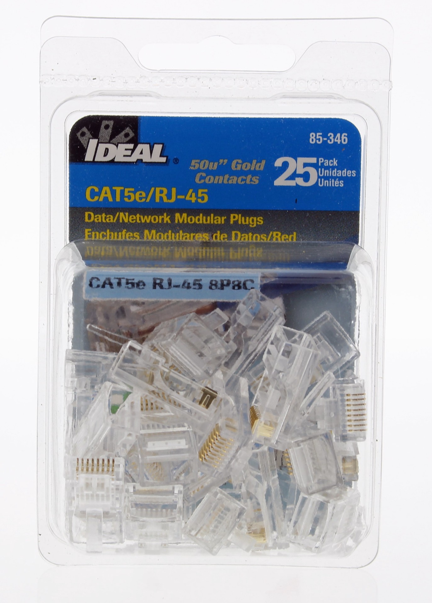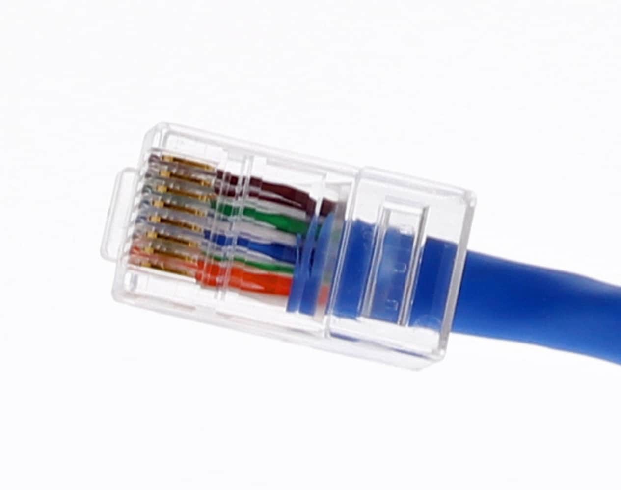 8-position, 8-contact RJ-45 modular plug for Cat 5e, 100 Ohm balanced twisted pair 100 MHz cables. 50 micro-inch gold plating on contact mating area for long term reliability in connectivity, even aft…