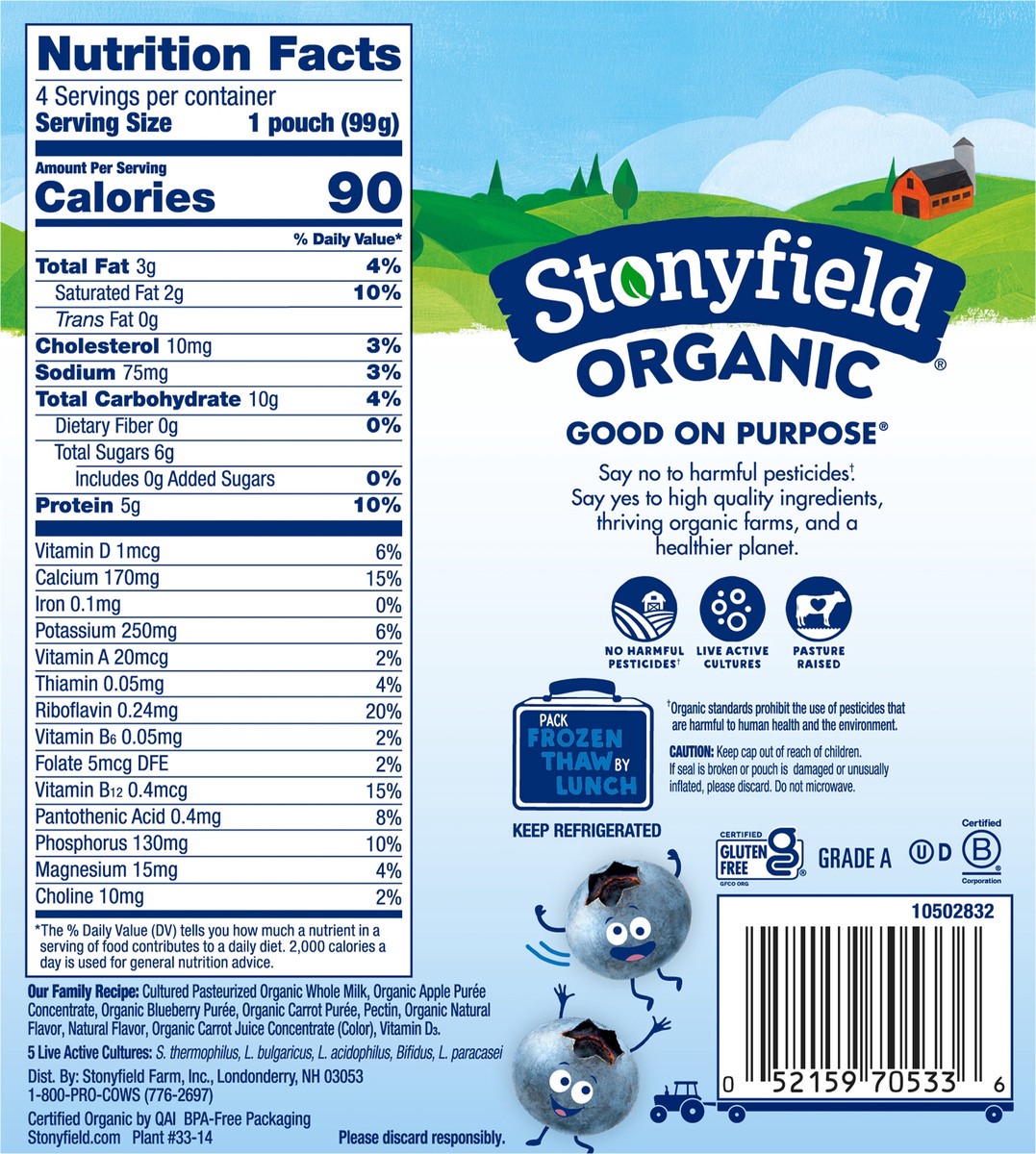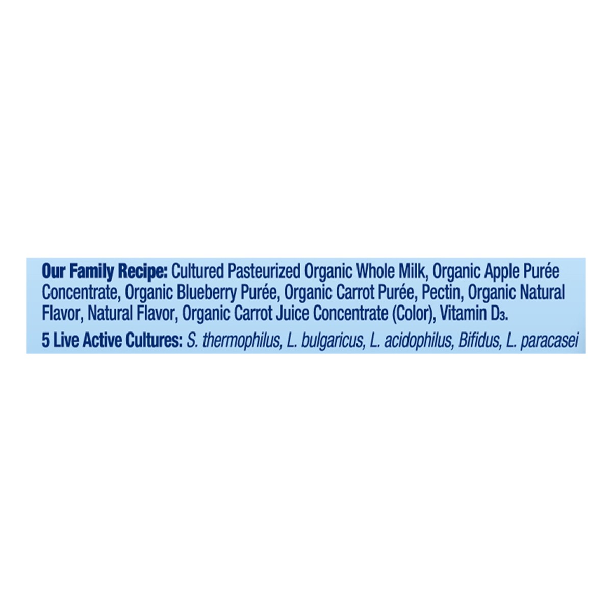 Our Family Recipe: Cultured Pasteurized Organic Whole Milk, Organic Apple Puree Concentrate, Organic Blueberry Purée, Organic Carrot Purée, Pectin, Organic Natural Flavor, Natural Flavor, Organic Carr…