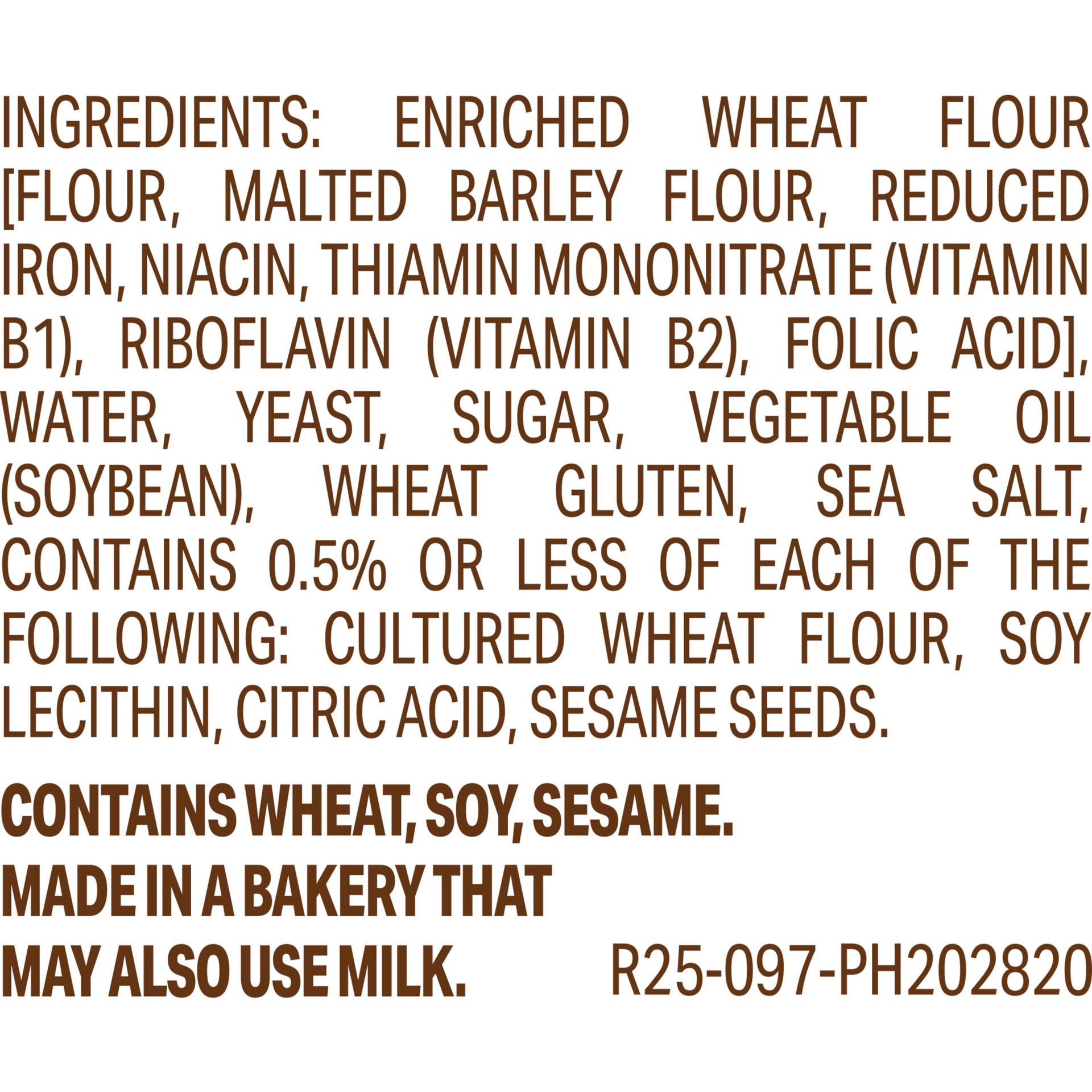 Enriched Wheat Flour [Flour, Malted Barley Flour, Reduced Iron, Niacin, Thiamin Mononitrate (Vitamin B1), Riboflavin (Vitamin B2), Folic Acid], Water, Yeast, Sugar, Vegetable Oil (Soybean), Wheat Glut…
