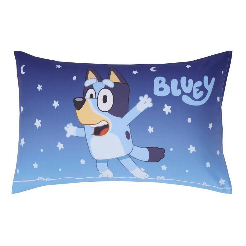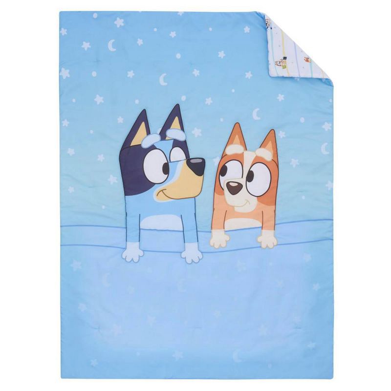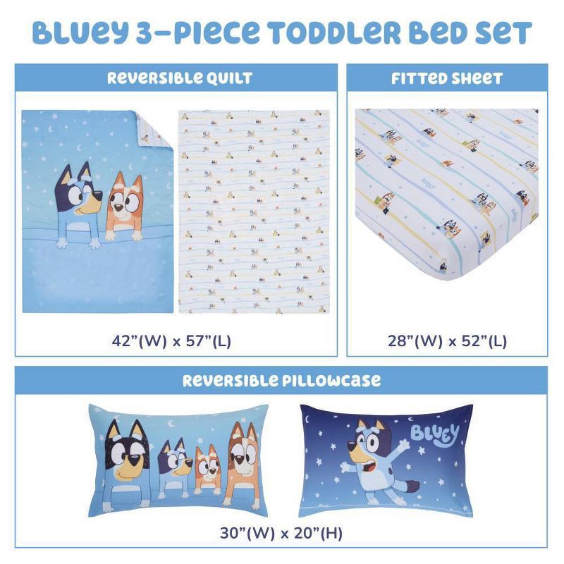 - The Bluey Sleepy Time 3 Piece Toddler Bed Set includes a comforter, fitted bottom sheet, and reversible pillowcase