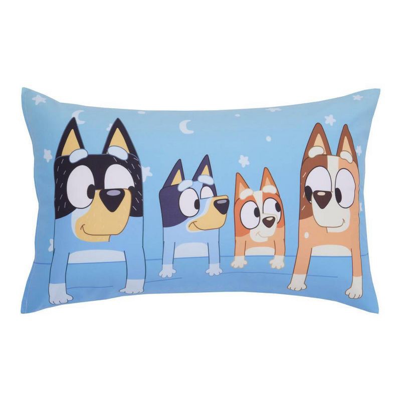 Drift into dreamland with the Bluey Sleepy Time 3-Piece Toddler Bed Set! Includes a comforter, fitted sheet, and reversible pillowcase featuring Bluey, Bingo, with Mum, and Dad in a playful starry nig…