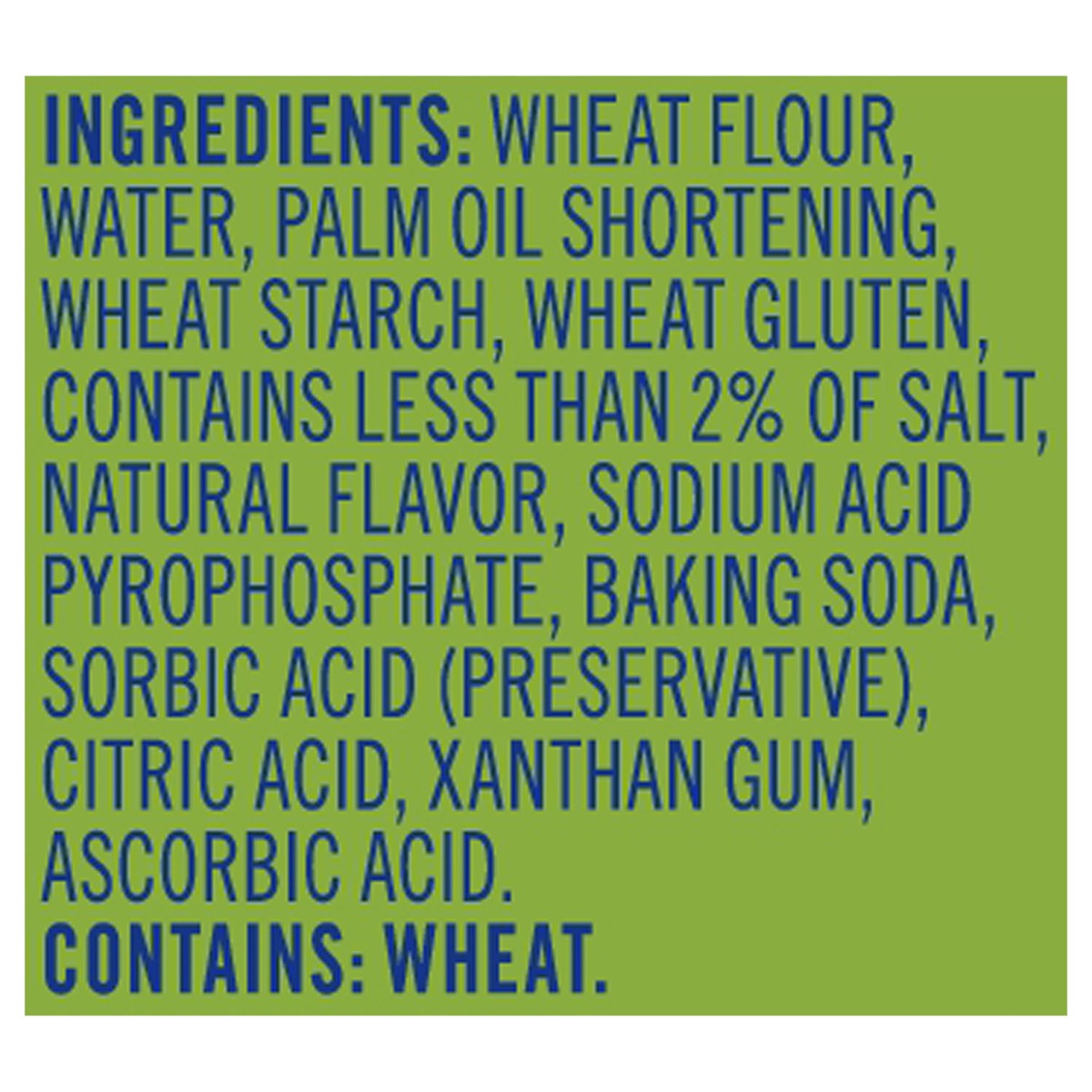 Wheat Flour, Water, Palm Oil Shortening, Wheat Starch, Wheat Gluten, Contains Less than 2% of Salt, Natural Flavor, Sodium Acid Pyrophosphate, Baking Soda, Sorbic Acid (Preservative), Citric Acid, Xan…