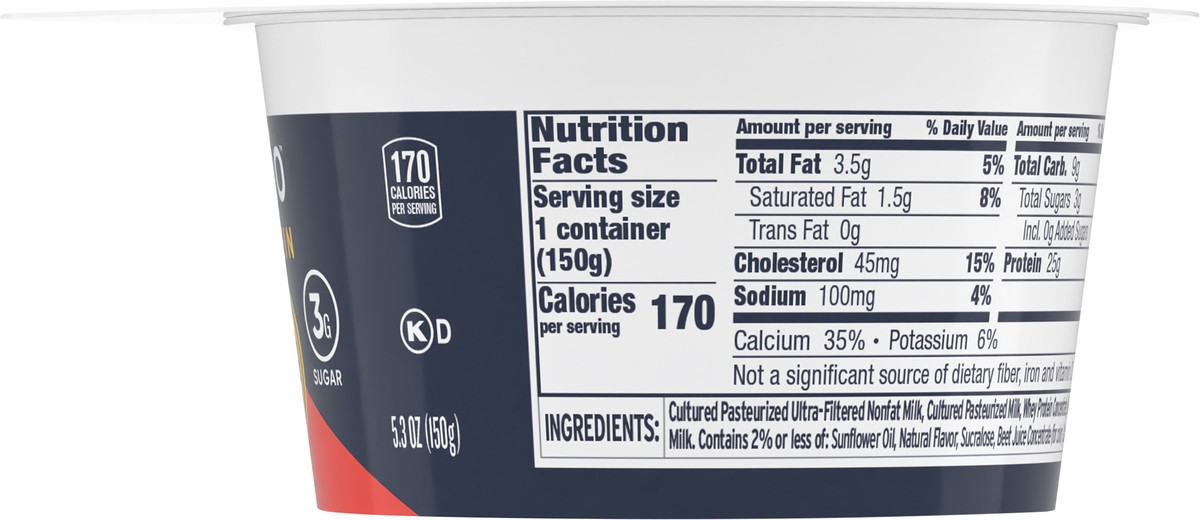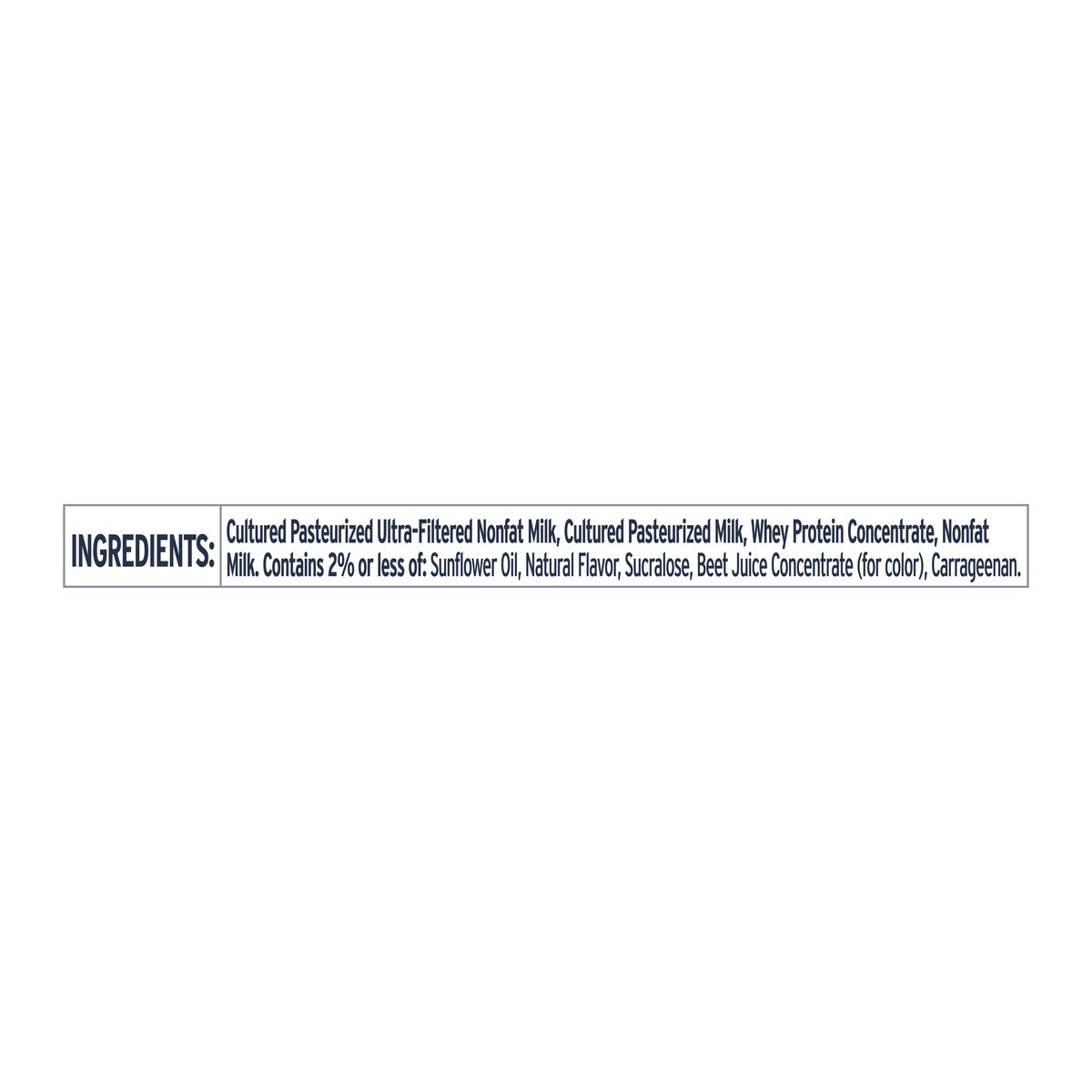 Cultured Pasteurized Ultra-Filtered Nonfat Milk, Cultured Pasteurized Milk, Whey Protein Concentrate, Nonfat Milk. Contains 2% or Less of: Sunflower Oil, Natural Flavor, Sucralose, Beet Juice Concentr…