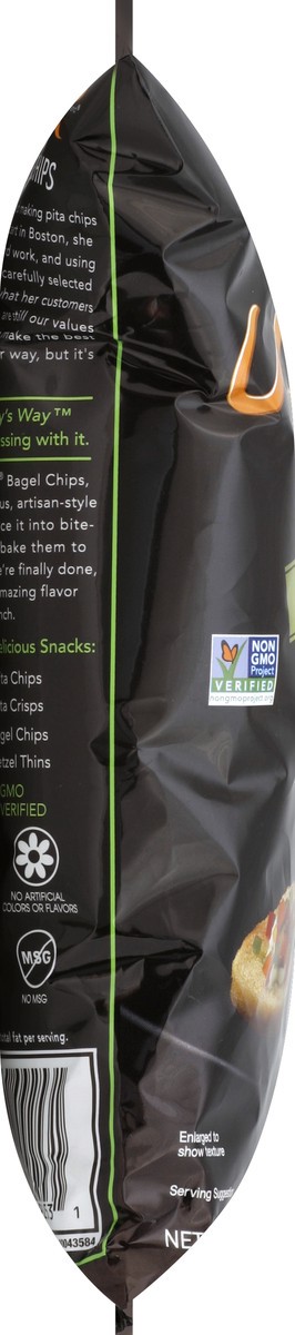 Baked. Bite sized real bagel taste. Per 1 oz Serving: 130 calories; 0.5 g sat fat (2% DV); 300 mg sodium (12% DV); 2 g sugars. Non GMO Project verified. nongmoproject.org. Our original bagel chip is a…