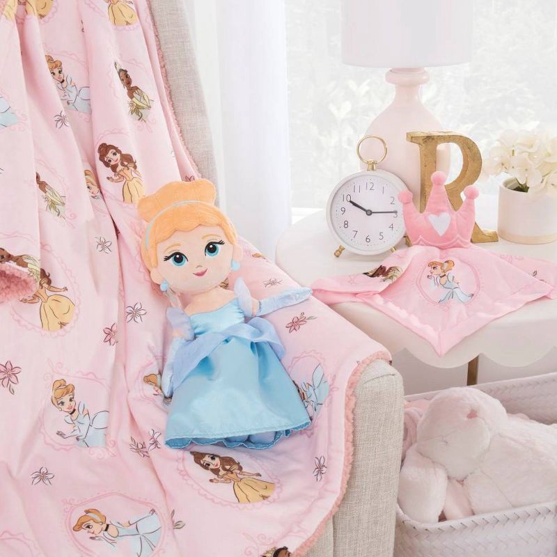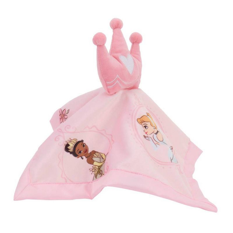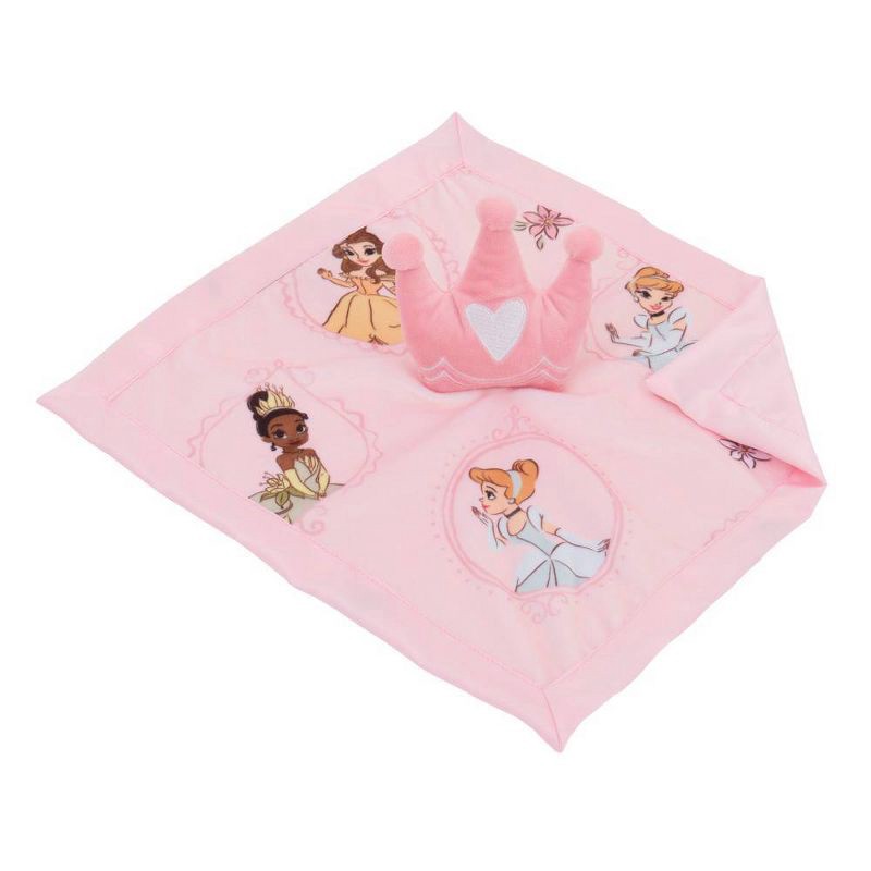 - Features a dimensional pink tiara attached to a plush 12" blankie, with Princess Tiana, Belle, and Cinderella