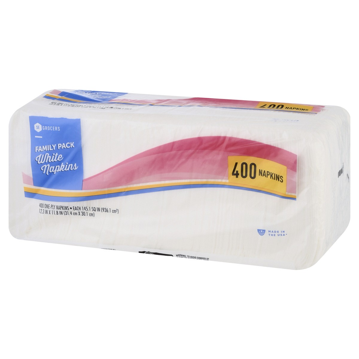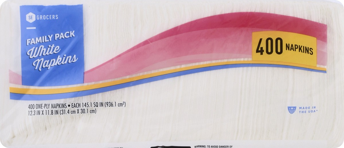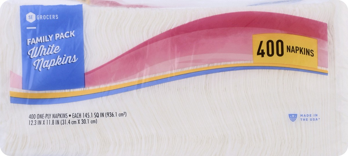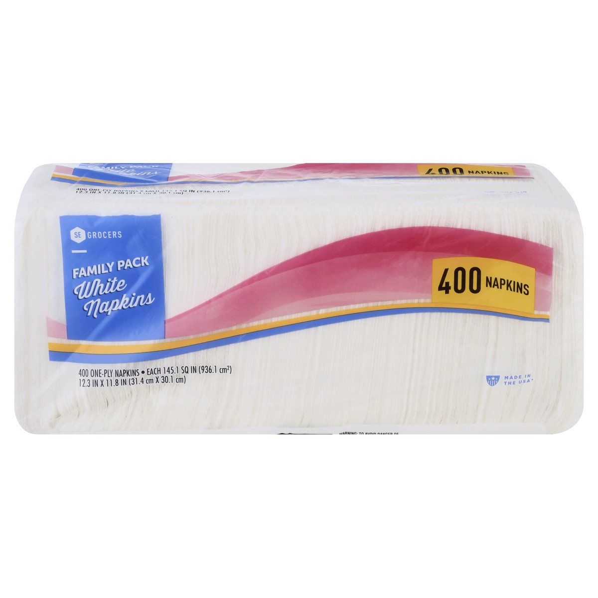 400 one-ply napkins. Each 145.1 sq inches (936.1 cm2) 12.3 inches x 11.8 inches (31.4 cm x 30.1 cm). SE Grocers has everything you could want, at a price to suit your wallet. Everyday products you can…