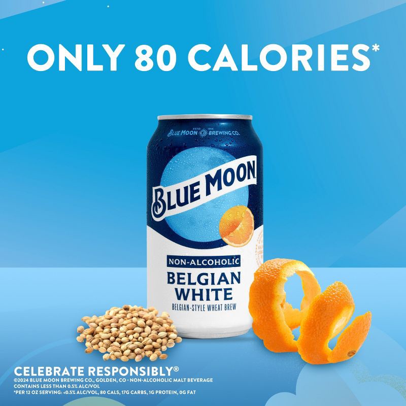 - 6 pack of 12 fl oz cans of of Blue Moon Non Alcoholic Belgian Style Wheat Beer