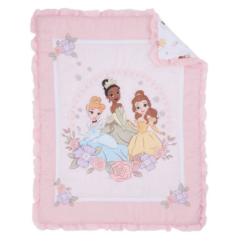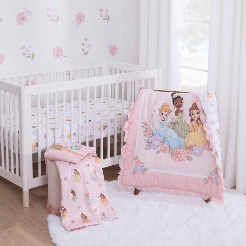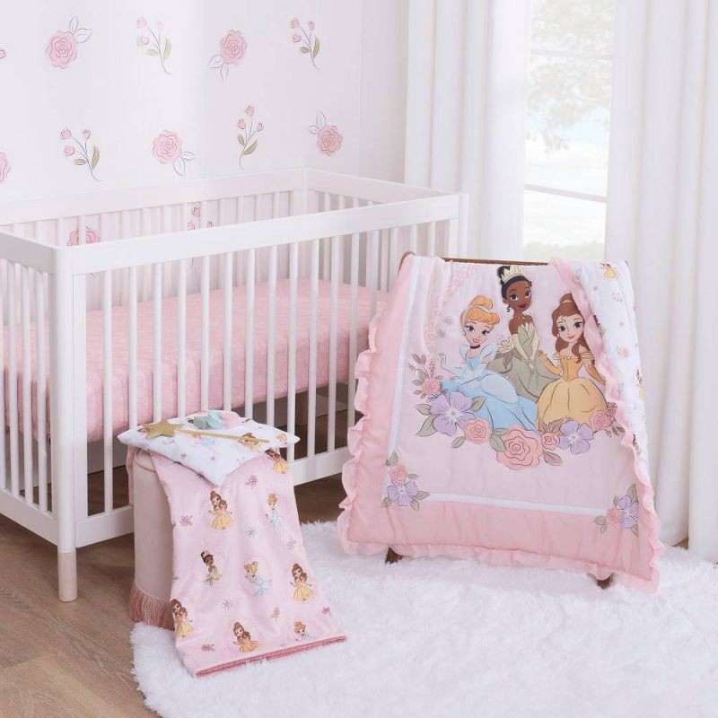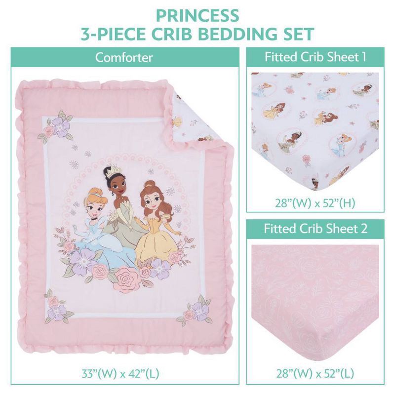 - The NoJo Disney Princess Dreams in Bloom 3-Piece Crib Bedding Set includes a Comforter, and Two Printed Fitted Crib Sheets