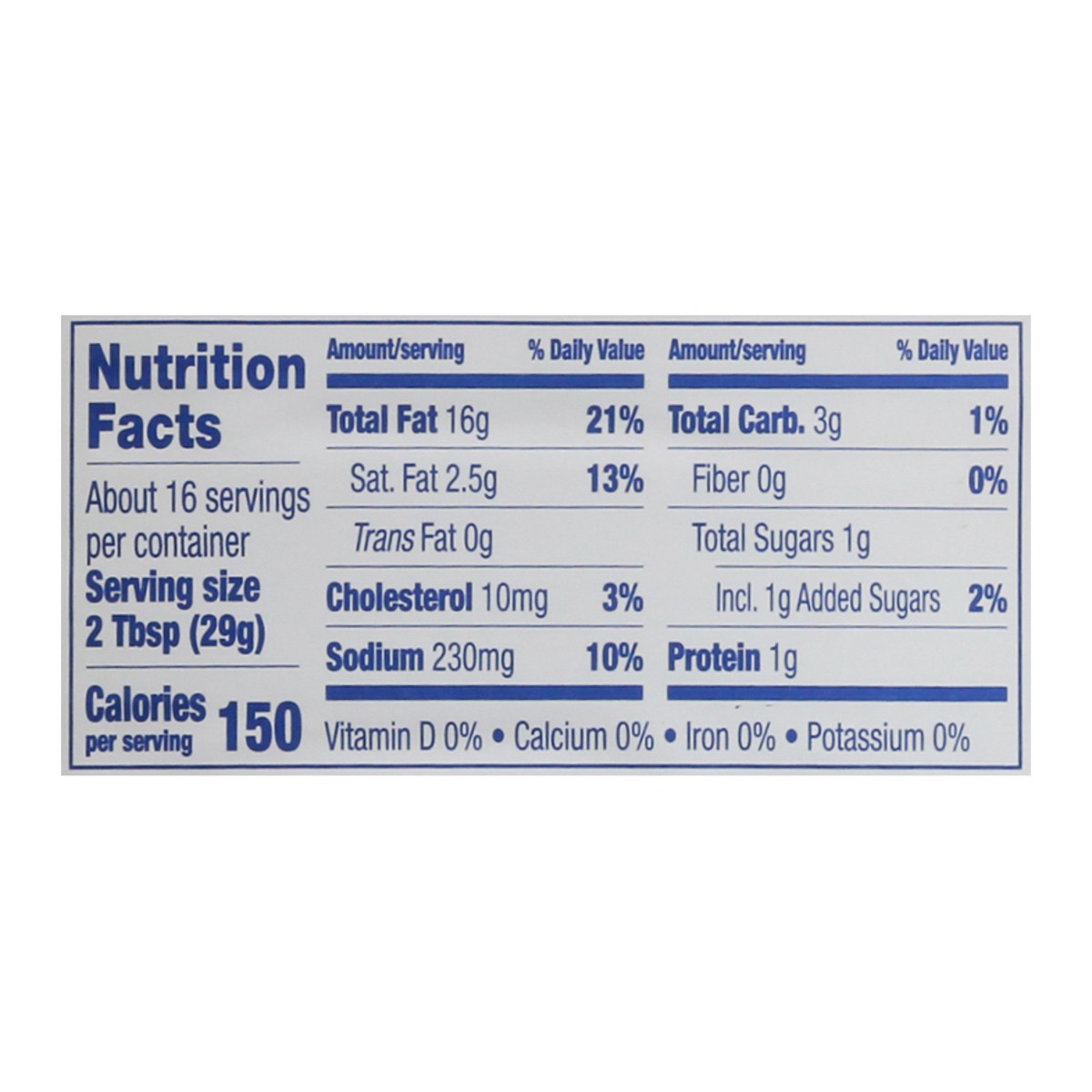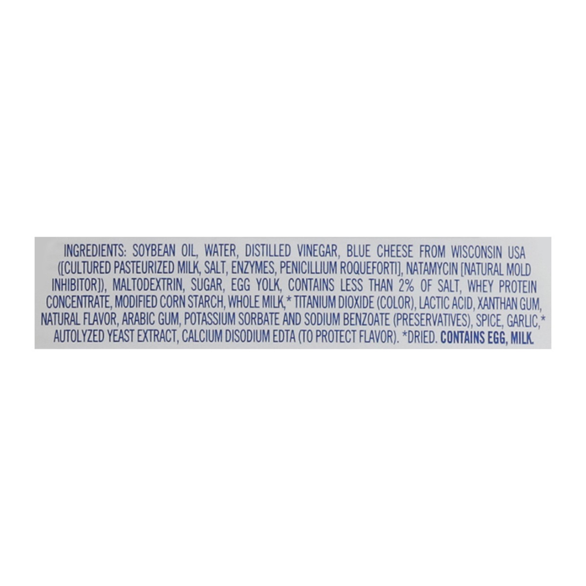 Soybean Oil, Water, Distilled Vinegar, Blue Cheese from Wisconsin USA ([Cultured Pasteurized Milk, Salt, Enzymes, Penicillium Roqueforti], Natamycin [Natural Mold Inhibitor]), Maltodextrin, Sugar, Egg…