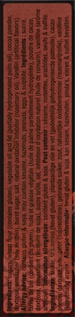 Sugar, Wheat Flour (Gluten), Vegetable Oil and Fat (Palm), Corn Starch, Soy Flour, Cocoa Powder, Caramel, Dextrose, Hazelnuts, Soy Lecithin (Emulsifier), Salt, Rosemary Oil (Antioxidant), Vanillin (Ar…