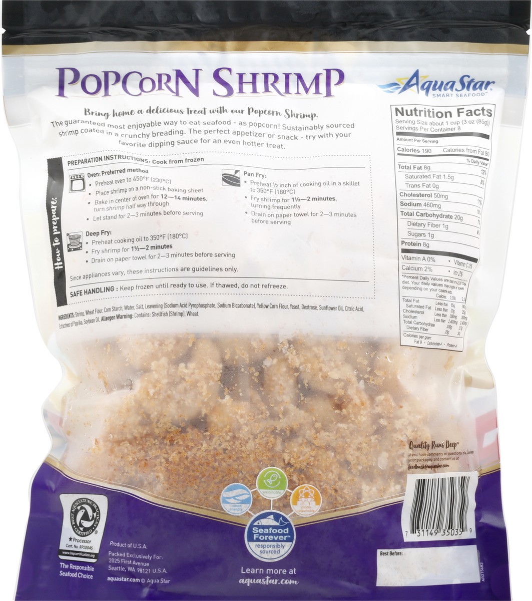 Smart seafood. Reserve. Oven ready. Ready to cook. Bring home a delicious treat with our popcorn shrimp. The guaranteed most enjoyable way to eat seafood - as popcorn! Sustainably sourced shrimp coate…