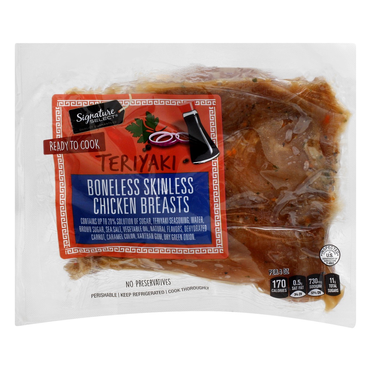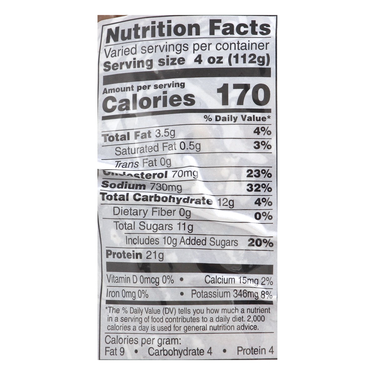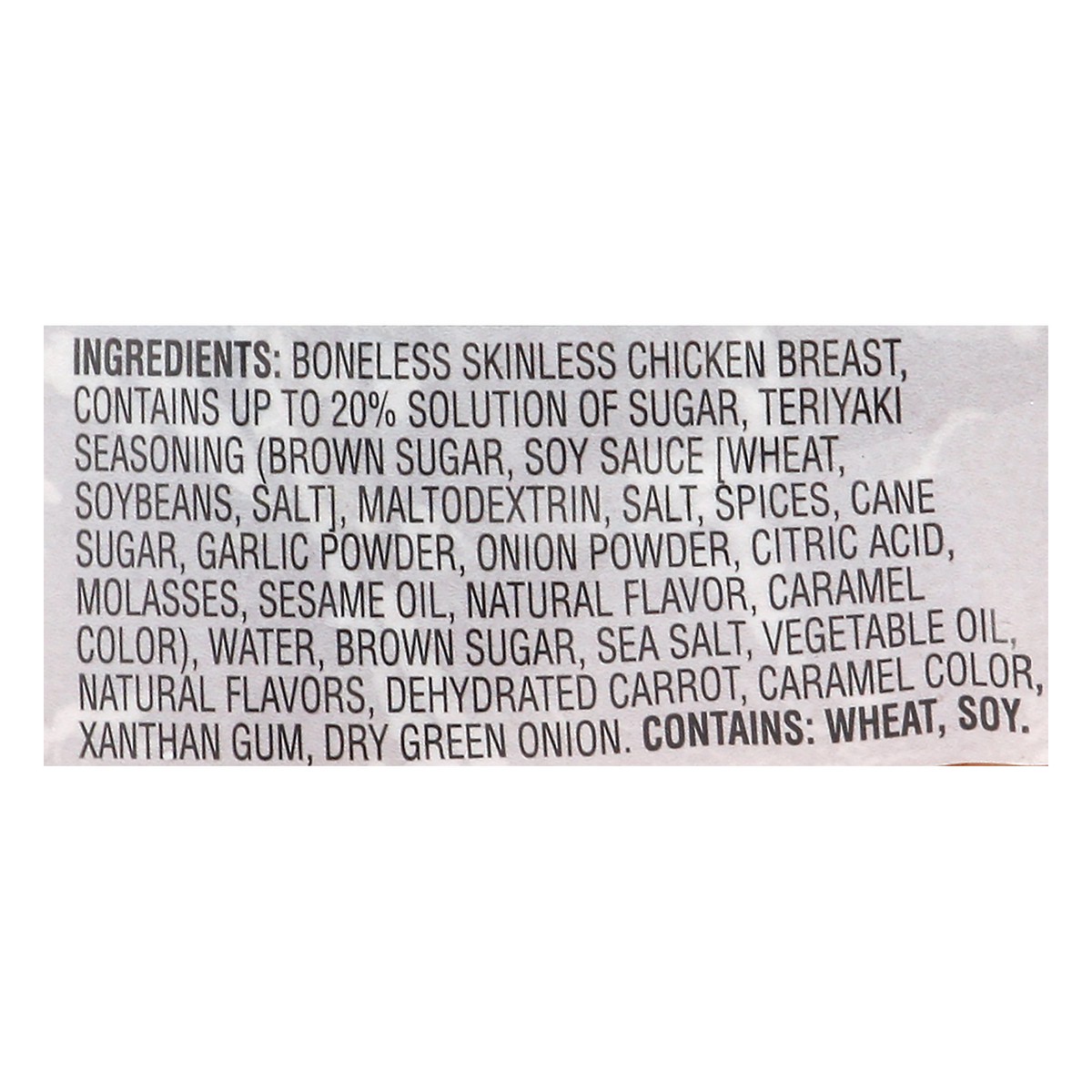 Per 4 oz: 170 calories; 0.5 g sat fat (3% DV); 730 mg sodium (32% DV); 11 g total sugars. Ready to cook. Contains up to 20% solution of sugar, teriyaki seasoning, water, brown sugar, sea salt, vegetab…