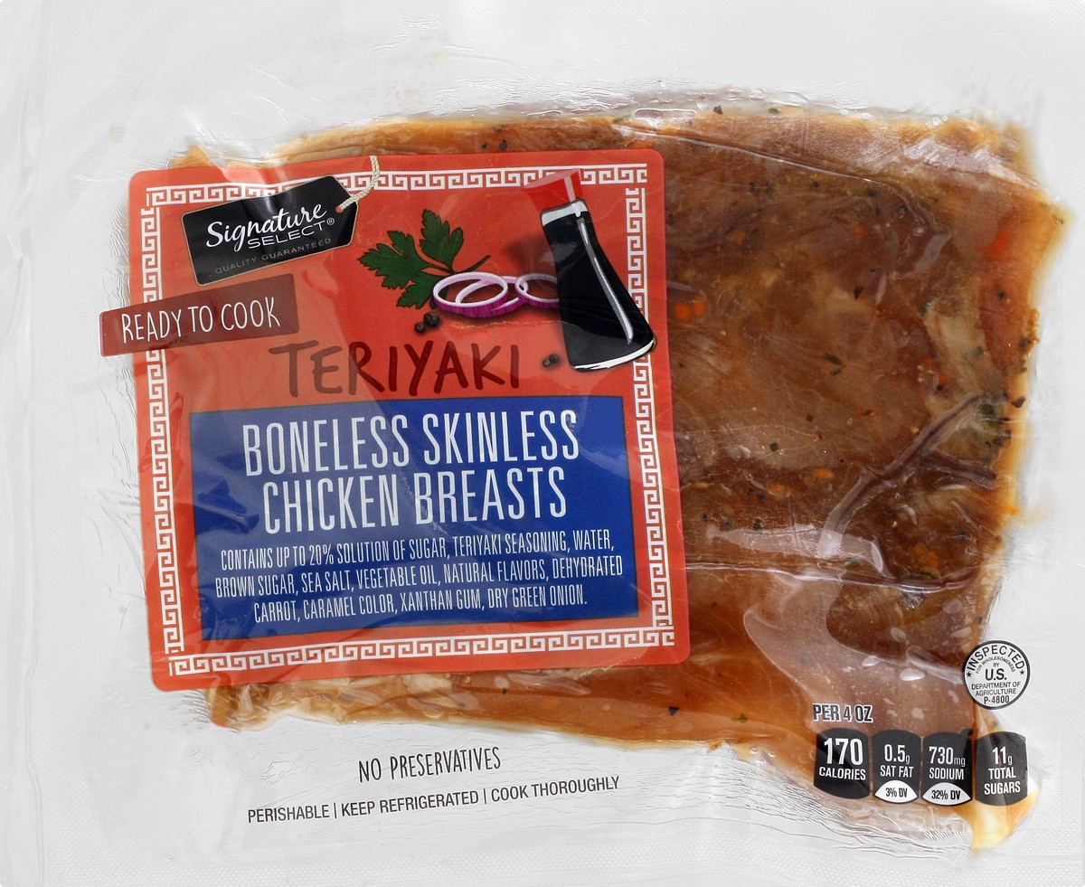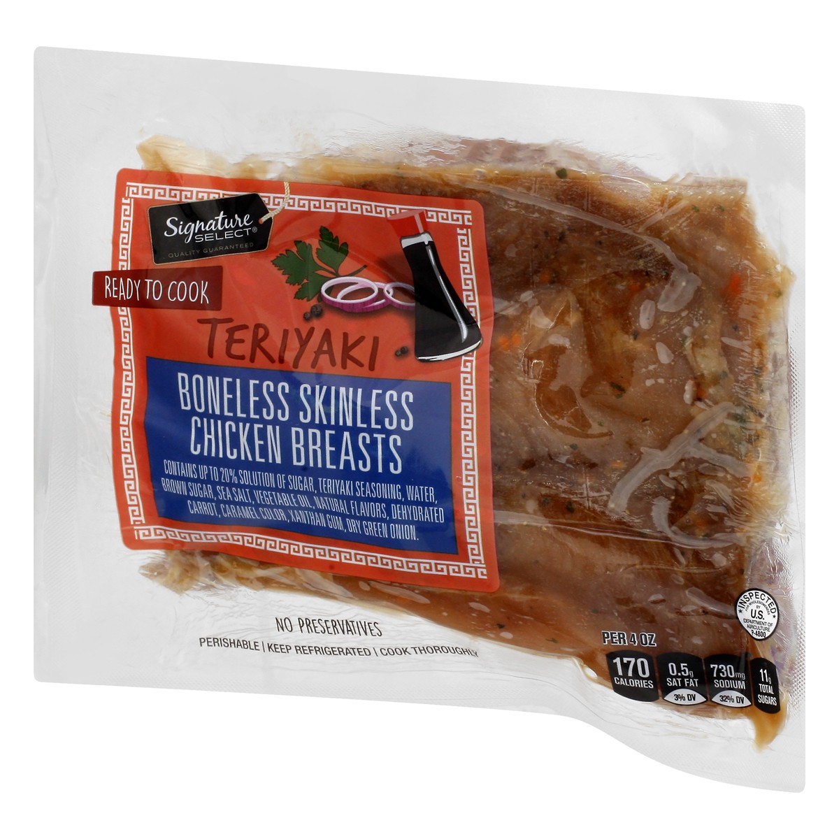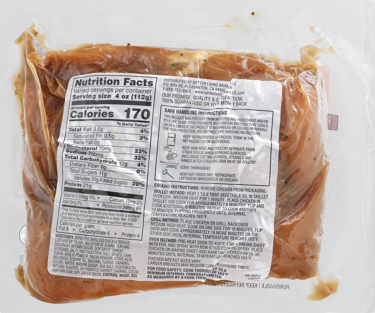 Per 4 oz: 170 calories; 0.5 g sat fat (3% DV); 730 mg sodium (32% DV); 11 g total sugars. Ready to cook. Contains up to 20% solution of sugar, teriyaki seasoning, water, brown sugar, sea salt, vegetab…
