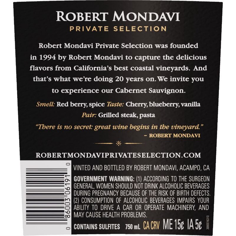 - One 750ml bottle of Robert Mondavi Private Selection Cabernet Sauvignon Red Wine, containing five 5 fl. oz. glasses of wine