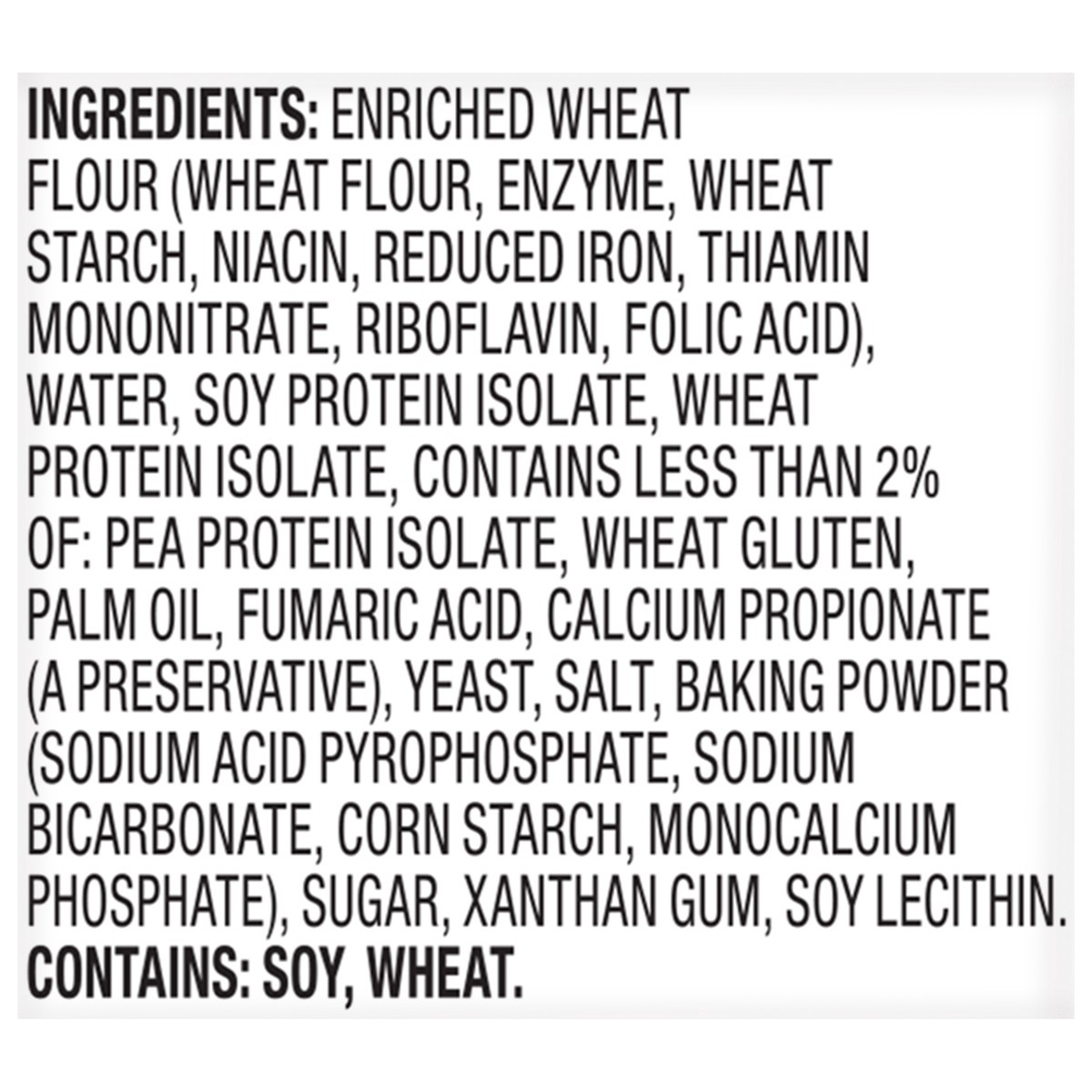 Enriched Wheat Flour (Wheat Flour, Enzyme, Wheat Starch, Niacin, Reduced Iron, Thiamin Mononitrate, Riboflavin, Folic Acid), Water, Soy Protein Isolate, Wheat Protein Isolate, Contains Less than 2% of…