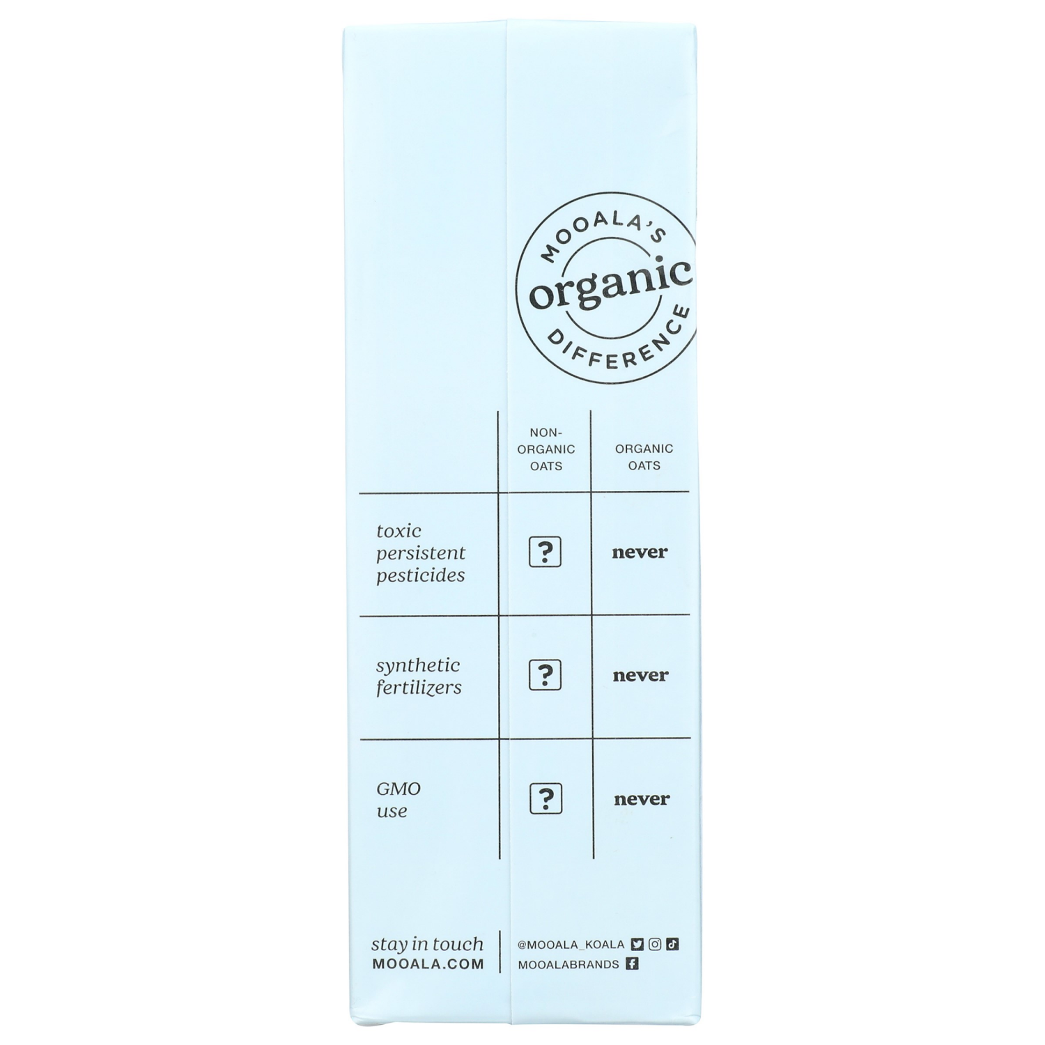 USDA Organic. Certified Organic by Pro-Cert. Water. Organic oats. Salt. Mooala's organic difference. Toxic Persistent Pesticides: Non-Organic Oats: ?; Organic Oats: Never. Synthetic Fertilizers: Non-O…