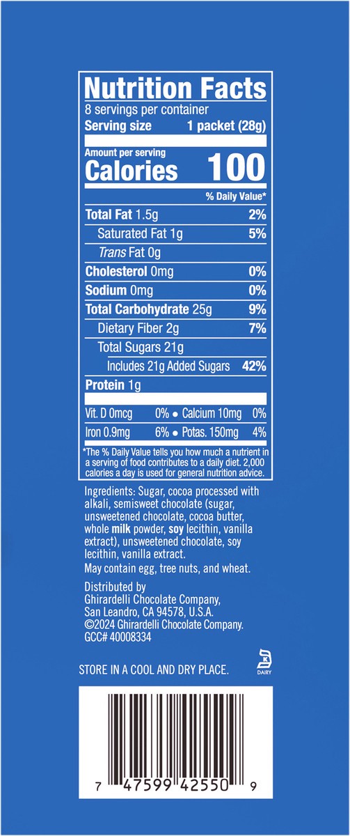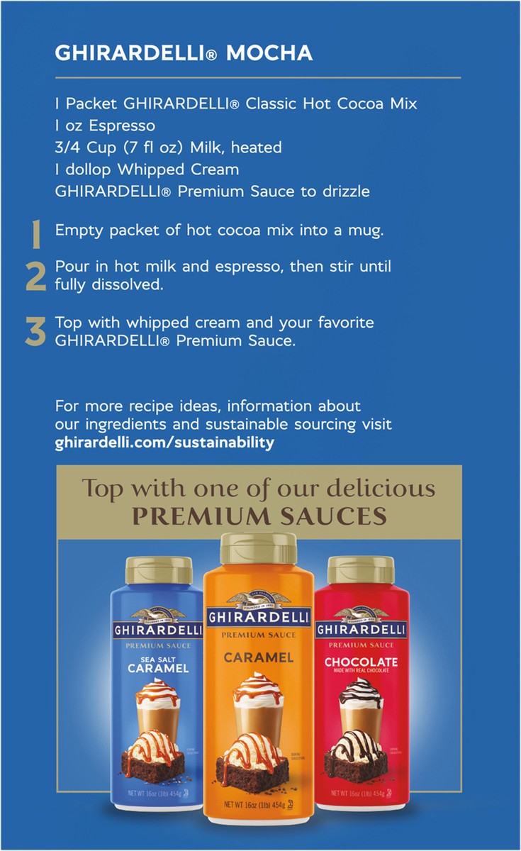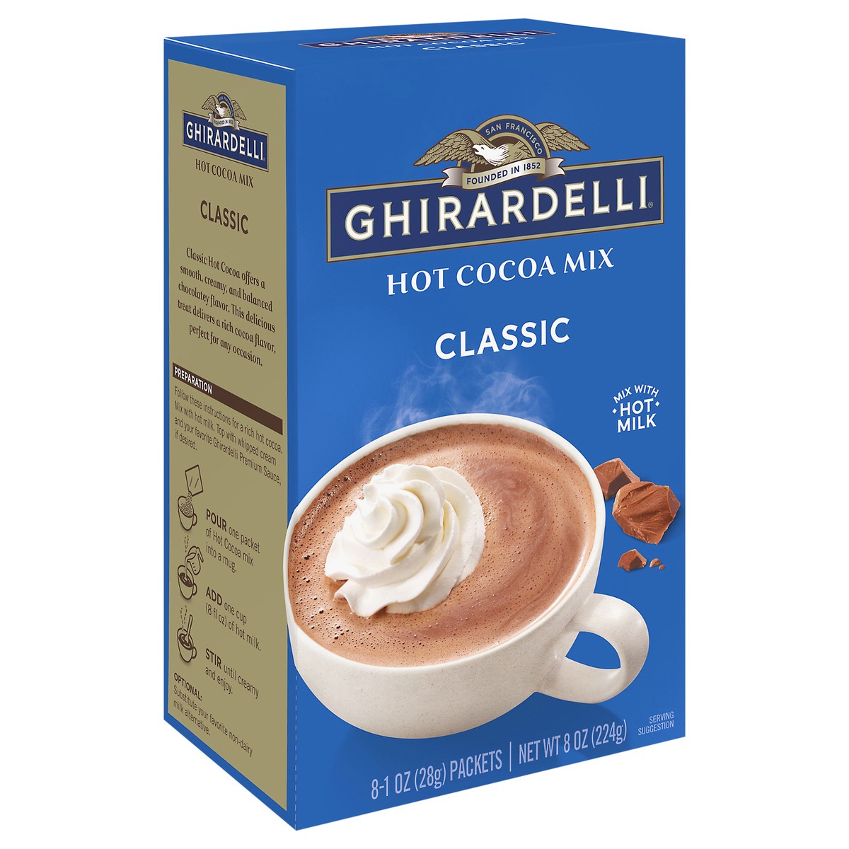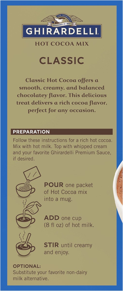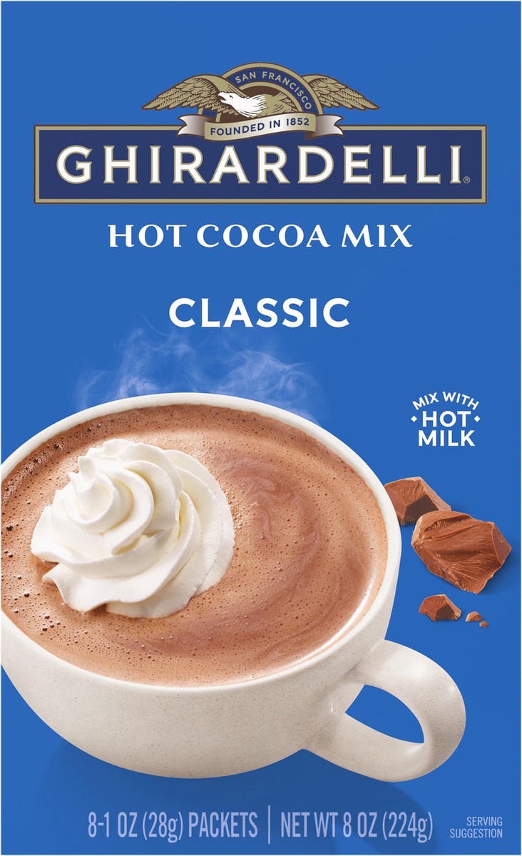 - Eight (8) 1 oz packets of GHIRARDELLI Classic Hot Cocoa Mix