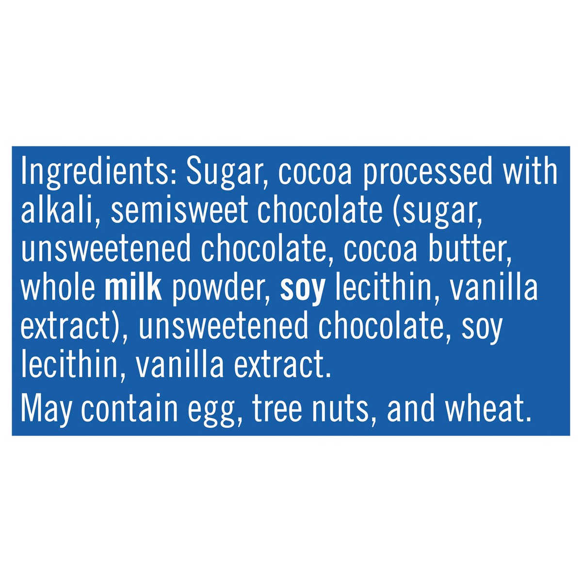 Sugar, Cocoa Processed with Alkali, Semisweet Chocolate (Sugar, Unsweetened Chocolate, Cocoa Butter, Whole Milk Powder, Soy Lecithin, Vanilla Extract), Unsweetened Chocolate, Soy Lecithin, Vanilla Ext…
