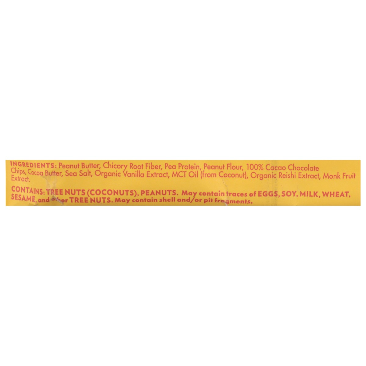 Peanut Butter, Chicory Root Fiber, Pea Protein, Peanut Flour, 100% Cacao Chocolate Chips, Cocoa Butter, Sea Salt, Organic Vanilla Extract, Mct Oil (from Coconut), Organic Reishi Extract, Monk Fruit Ex…
