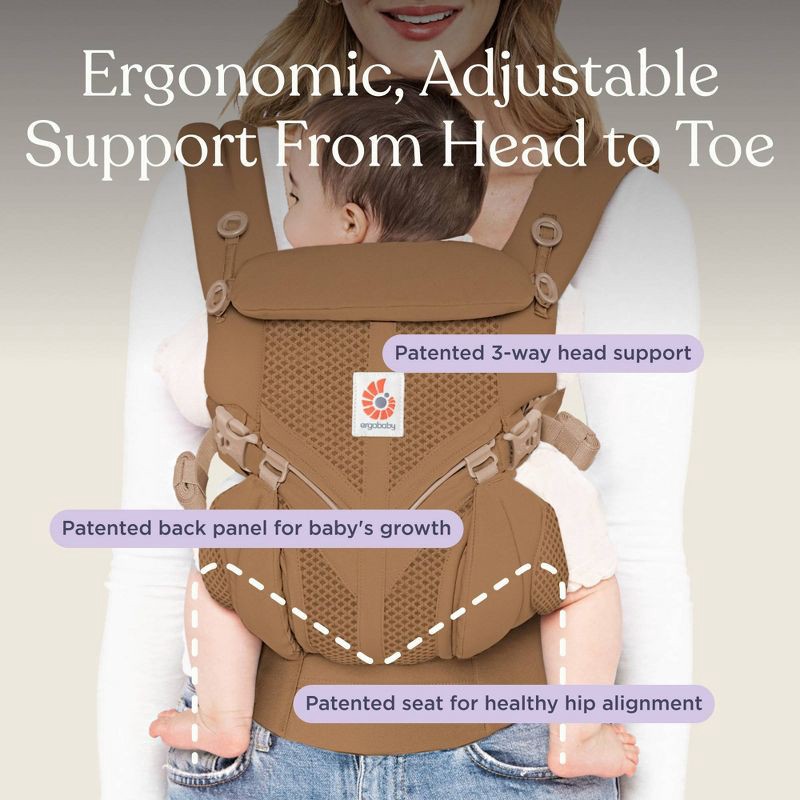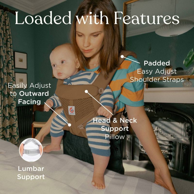Features: Adjustable Harness, Infant Head Support, Padded Shoulder Straps, Lumbar Support for Parent, Ventilated Fabric for Air Flow