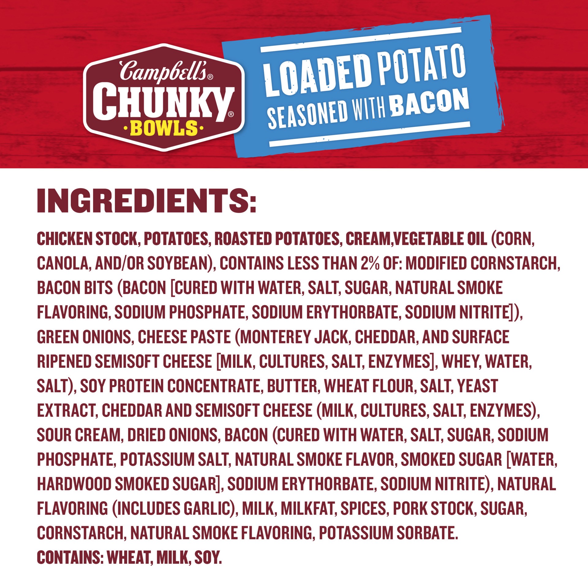 INGREDIENTS: CHICKEN STOCK, POTATOES, ROASTED POTATOES, CREAM, VEGETABLE OIL (CORN, CANOLA, AND/OR SOYBEAN), CONTAINS LESS THAN 2% OF: MODIFIED CORNSTARCH, BACON BITS (BACON [CURED WITH WATER, SALT, S…