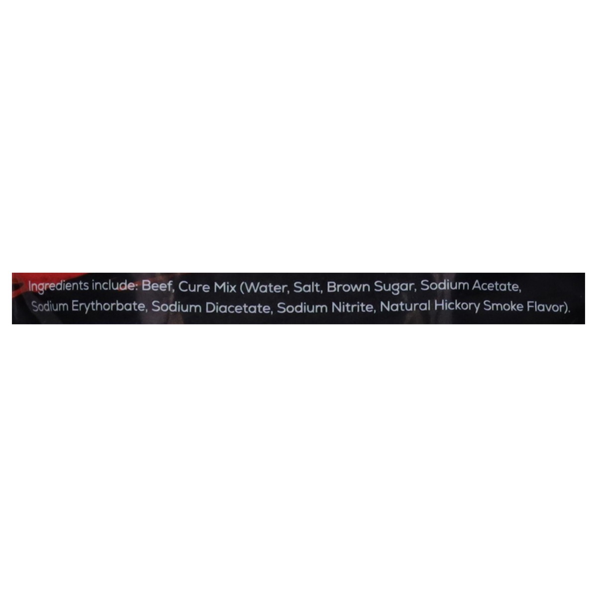 Ingredients Include: Beef, Cure Mix (Water, Salt, Brown Sugar, Sodium Acetate, Sodium Erythorbate, Sodium Diacetate, Sodium Nitrite, Natural Hickory Smoke Flavor).