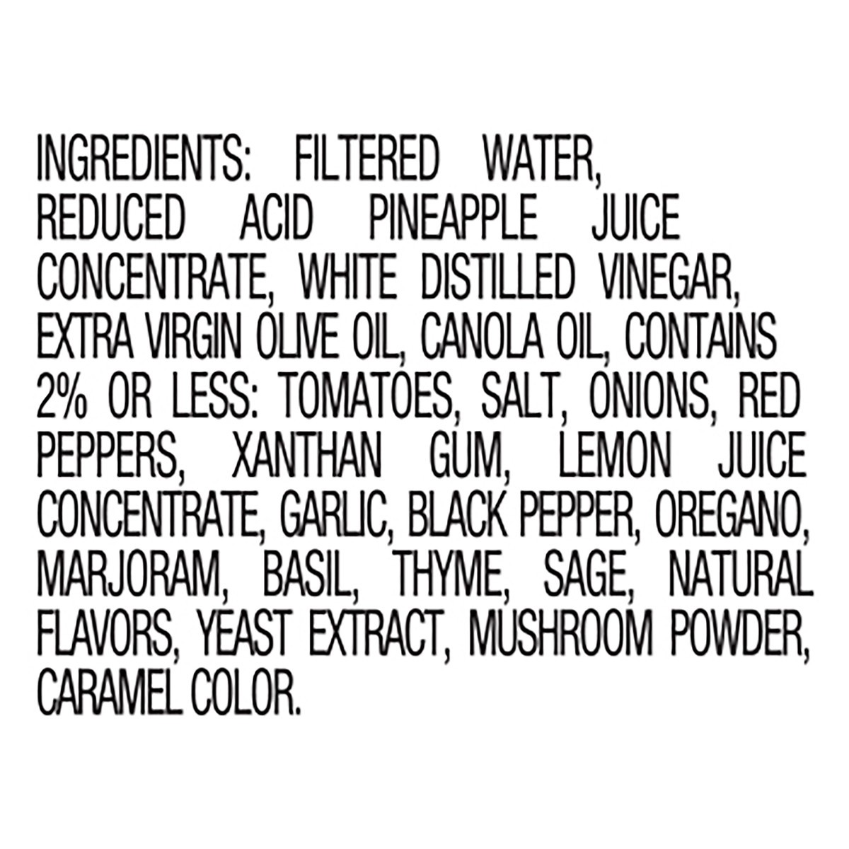 Filtered Water, Reduced Acid Pineapple Juice Concentrate, White Distilled Vinegar, Extra Virgin Olive Oil, Canola Oil, Contains 2% or Less: Tomatoes, Salt, Onions, Red Peppers, Xanthan Gum, Lemon Juic…