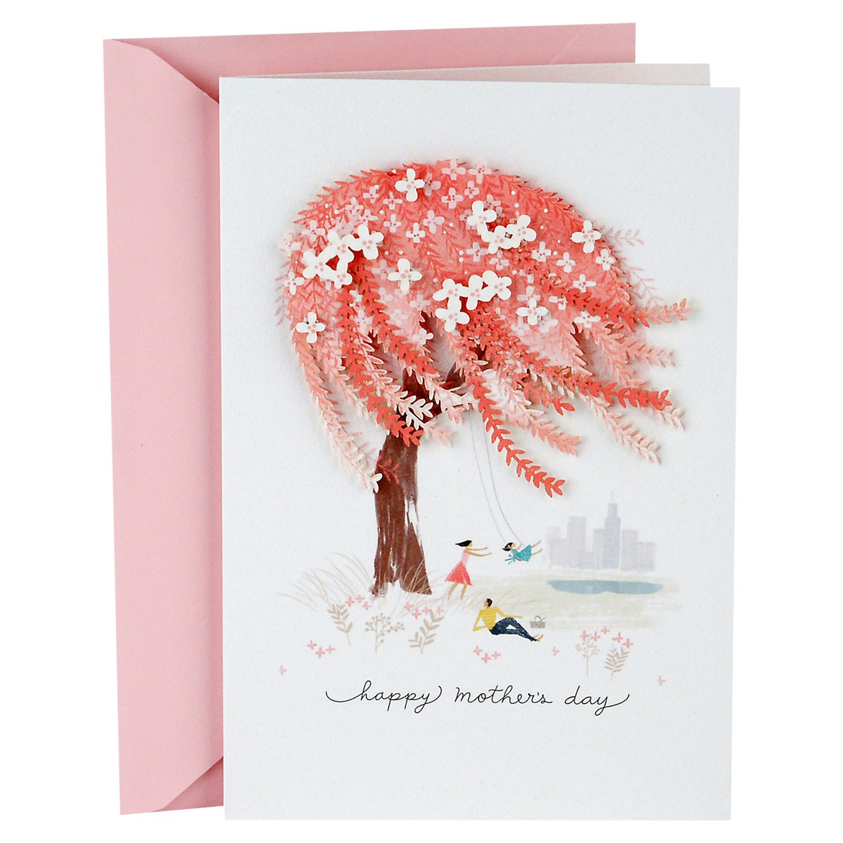 - Mother''s Day greeting card for wife features a watercolor scene of a family playing together in a city park under a pretty pink willow tree with die-cut flowers and vines. Glitter accents with 3D attachments.