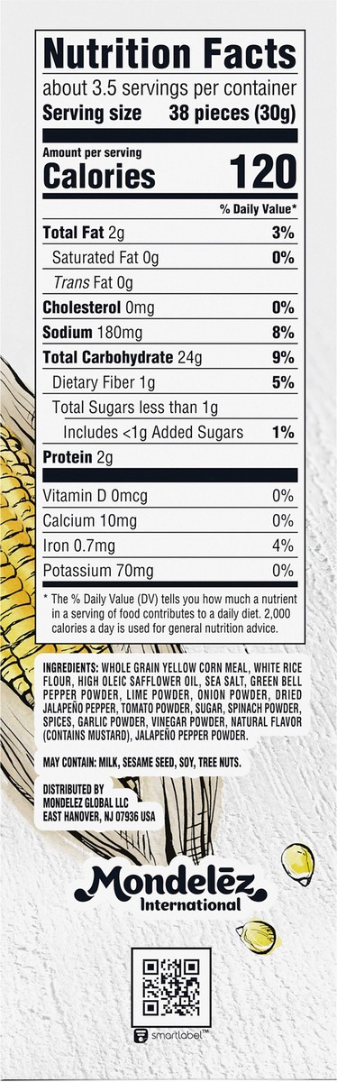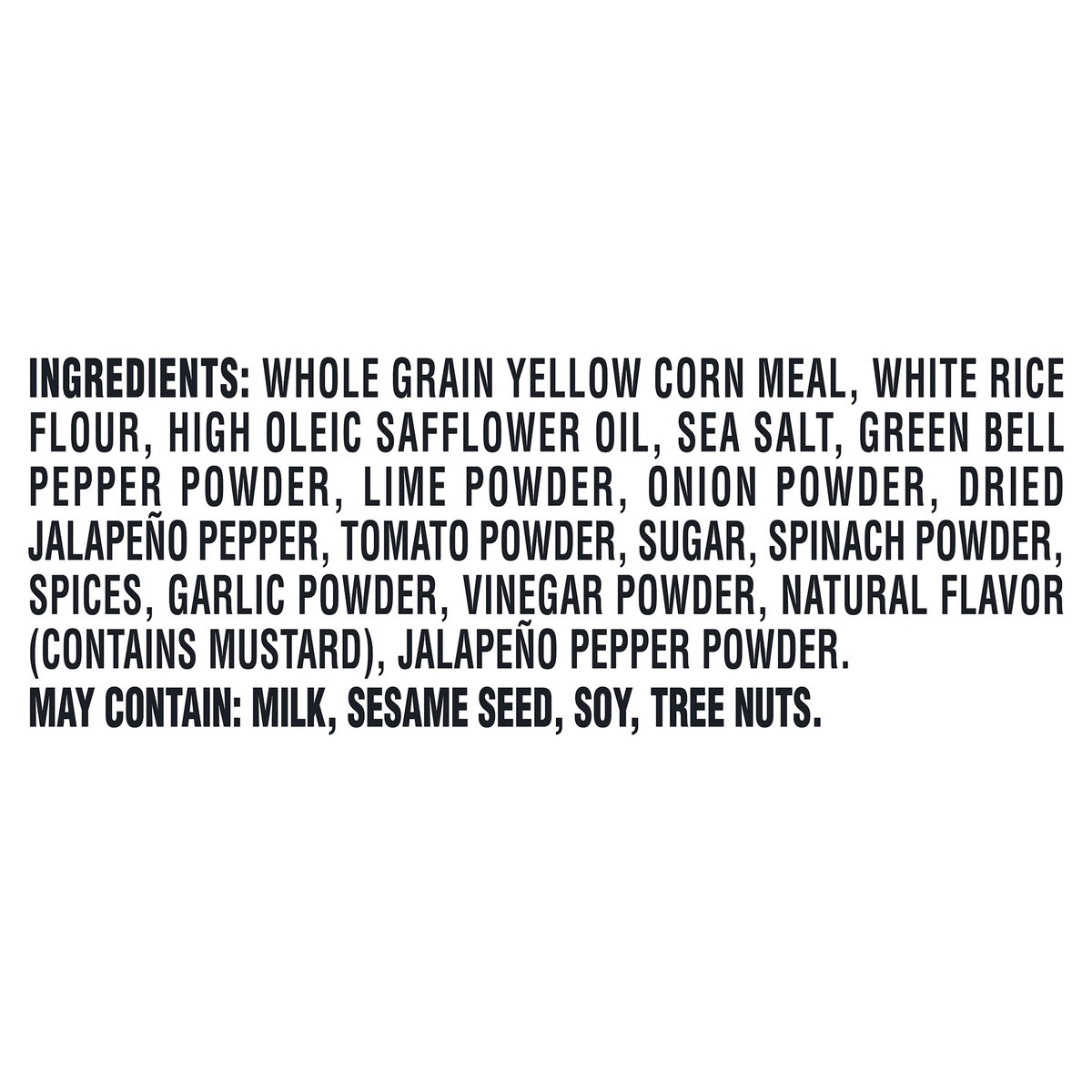 Whole Grain Yellow Corn Meal, White Rice Flour, High Oleic Safflower Oil, Sea Salt, Green Bell Pepper Powder, Lime Powder, Onion Powder, Dried Jalapeno Pepper, Tomato Powder, Sugar, Spinach Powder, Sp…