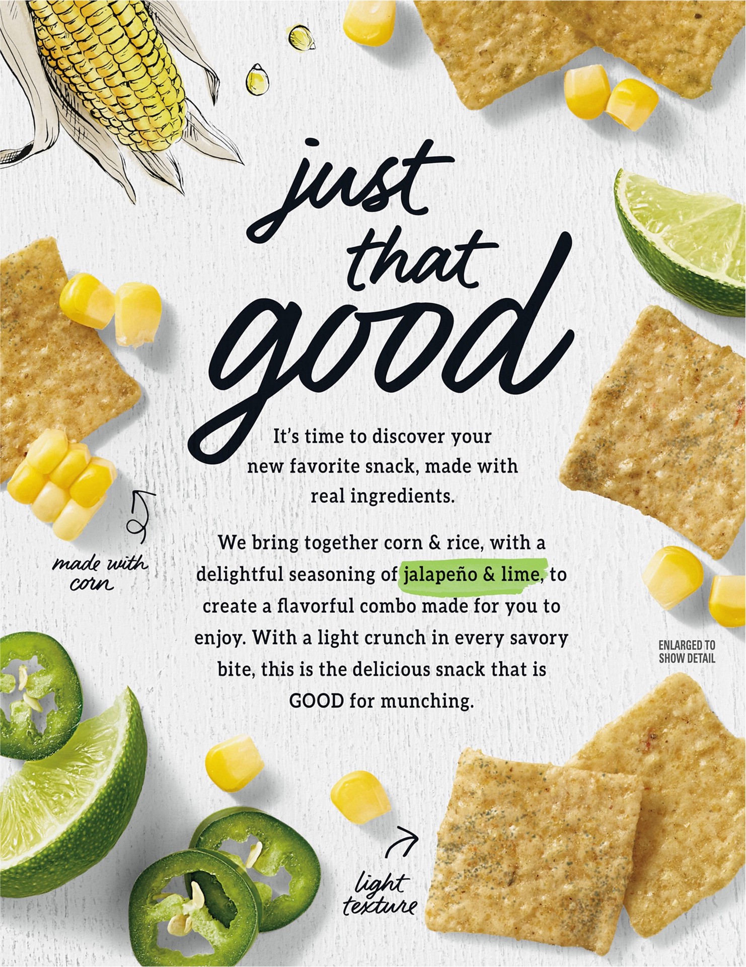 Enjoy a wholesome snack anytime, anywhere with GOOD THINS Jalapeño & Lime Corn & Rice Snacks Gluten Free Crackers. Crafted with corn and rice, these snack crackers are made with delicious goodness bak…