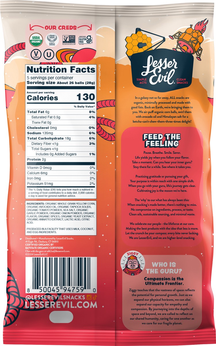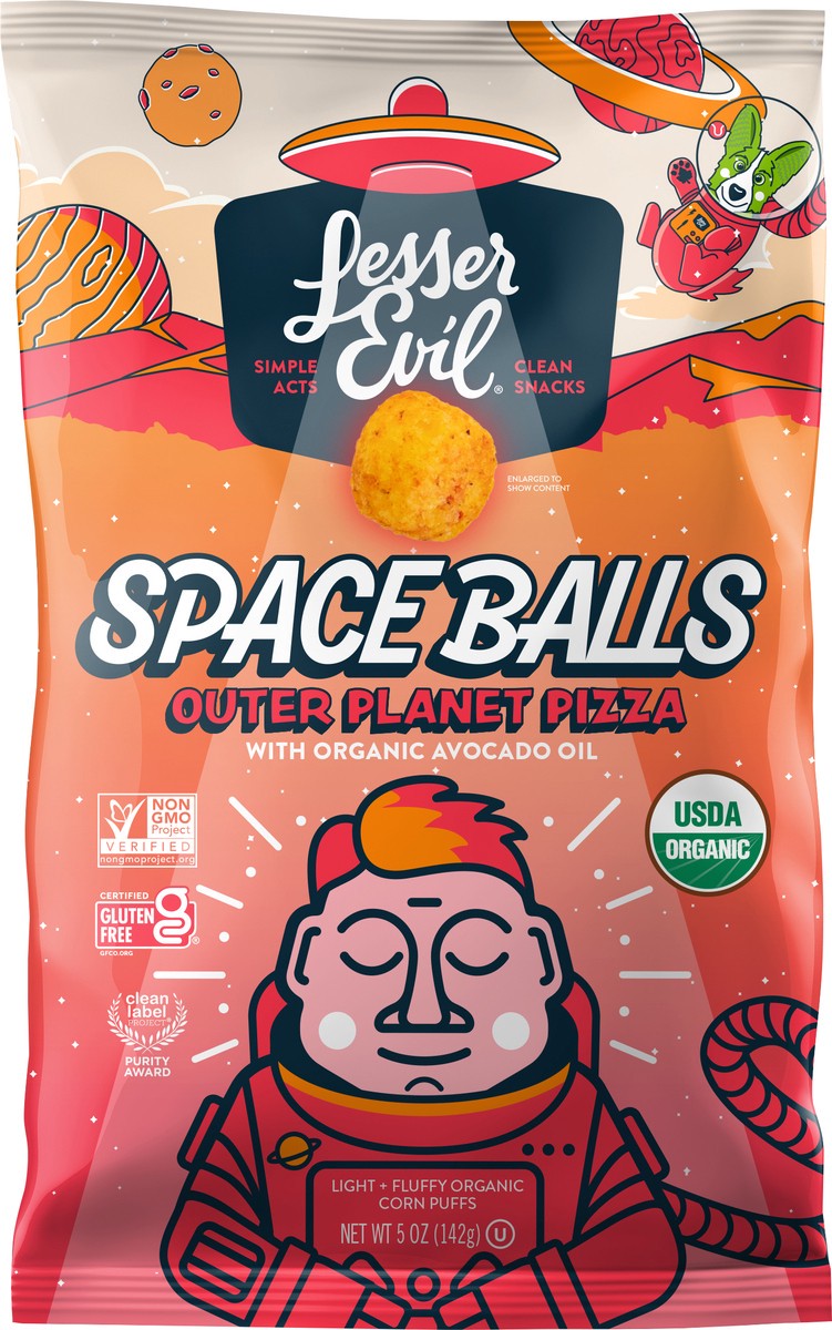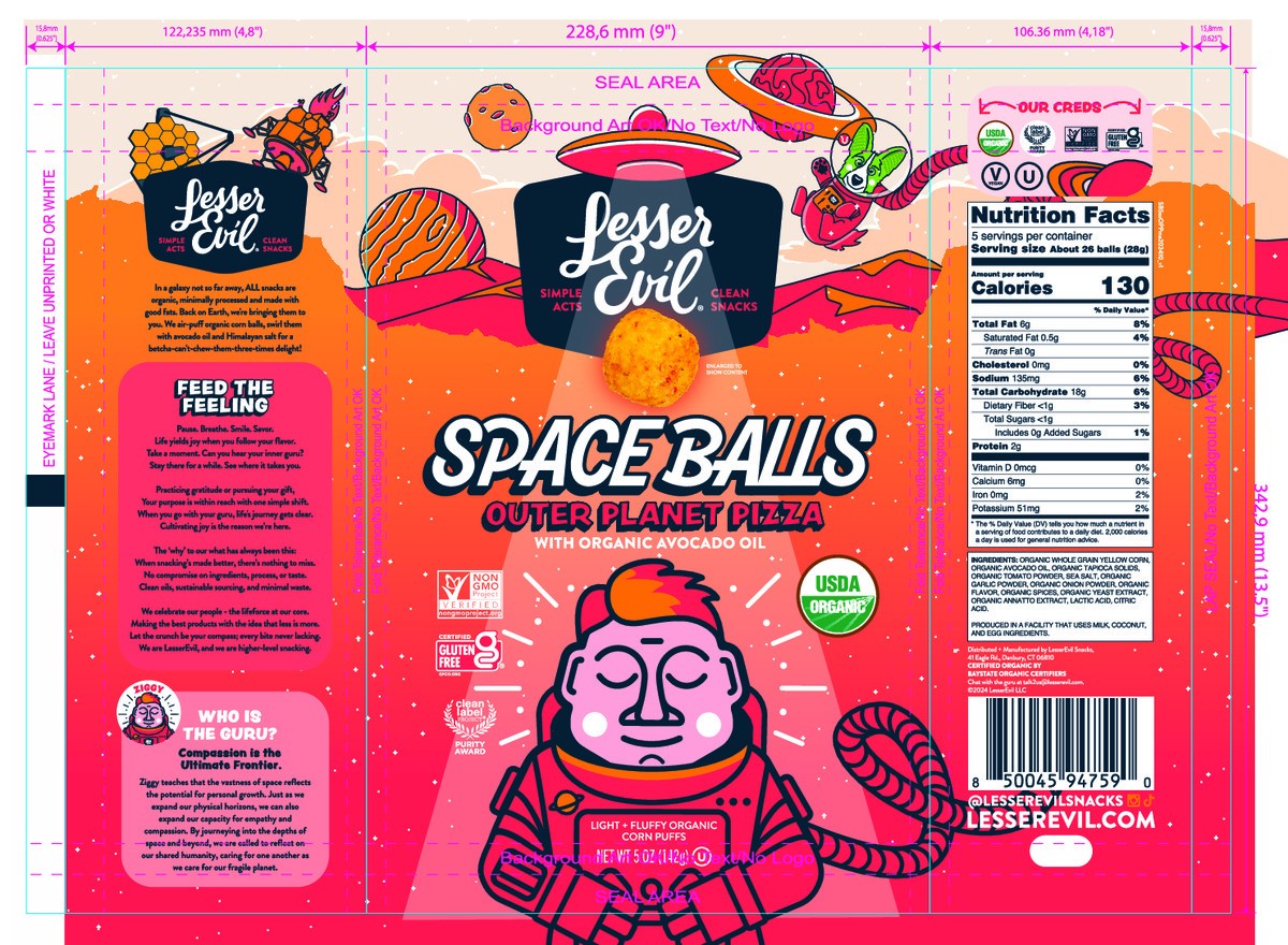 New Lesser Evil® Outer Planet Pizza Space Balls are cosmically clean and outta this world!Organic, Air-Puffed Whole Grain Yellow CornMade with Organic Avocado OilCertified Organic, Non-GMO, Gluten Fre…