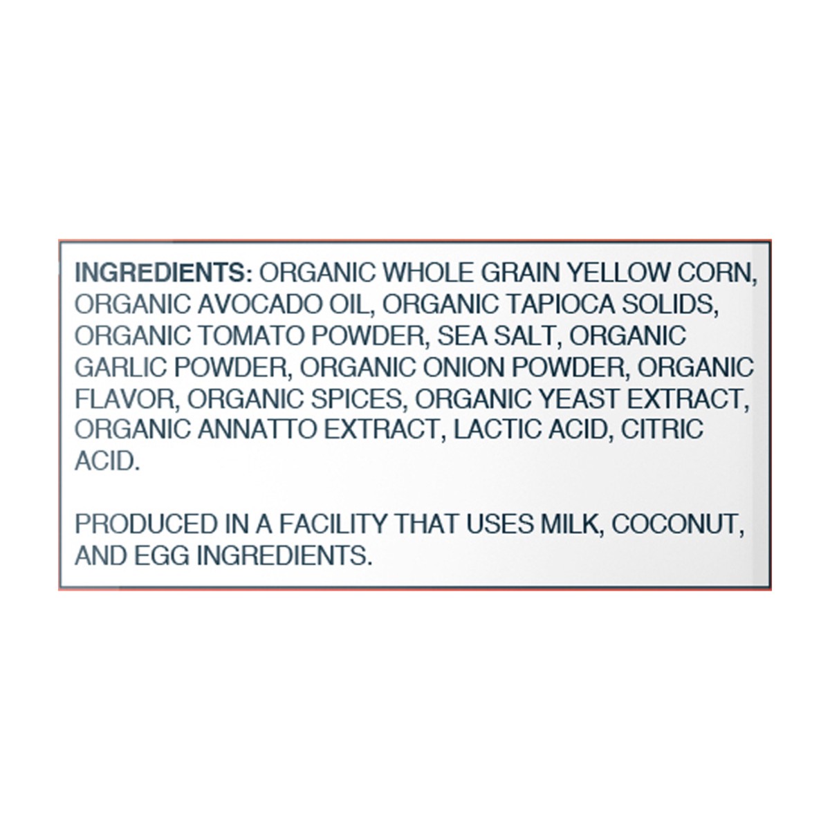 Organic Whole Grain Yellow Corn, Organic Avocado Oil, Organic Tapioca Solids, Organic Tomato Powder, Sea Salt, Organic Garlic Powder, Organic Onion Powder, Organic Flavor, Organic Spices, Organic Yeas…