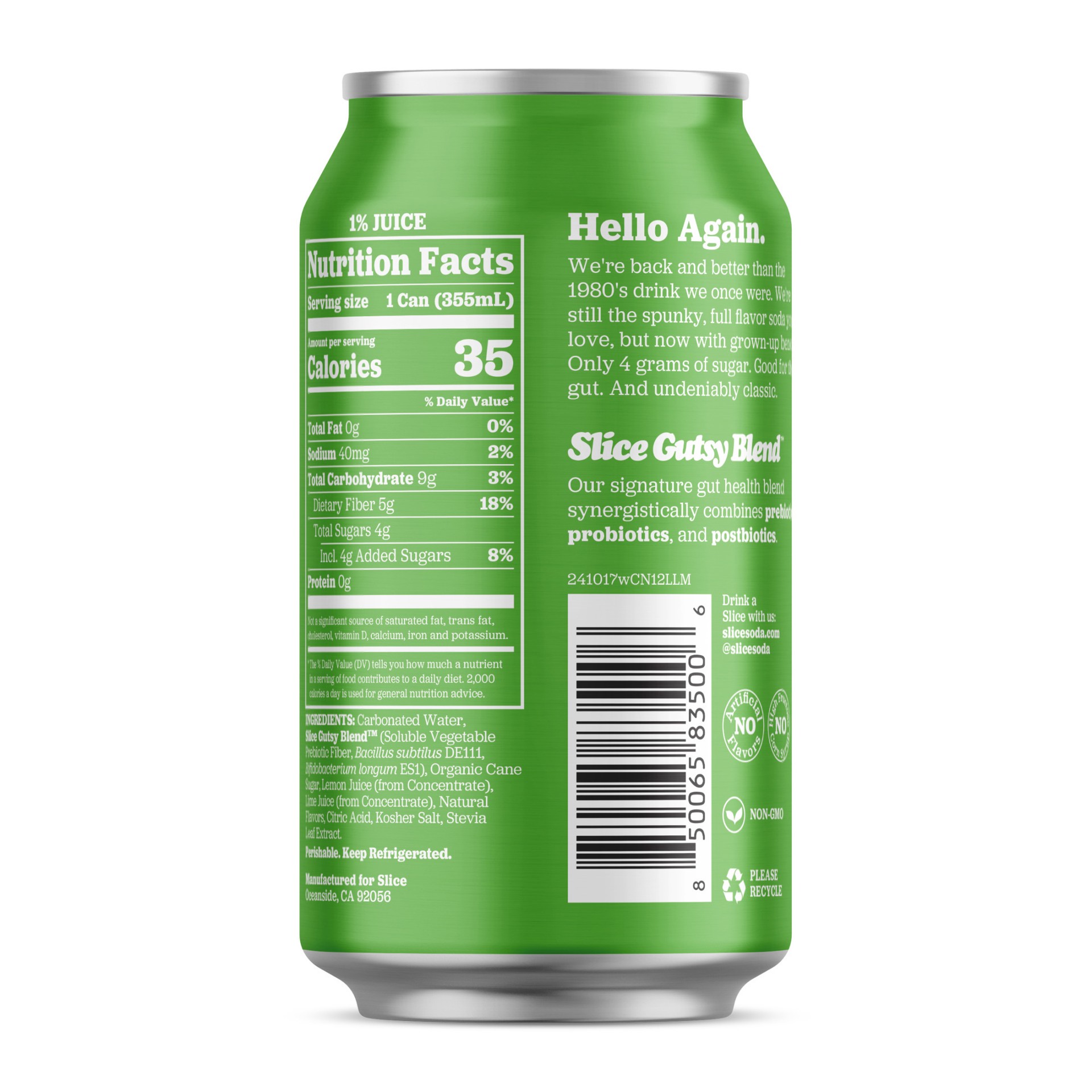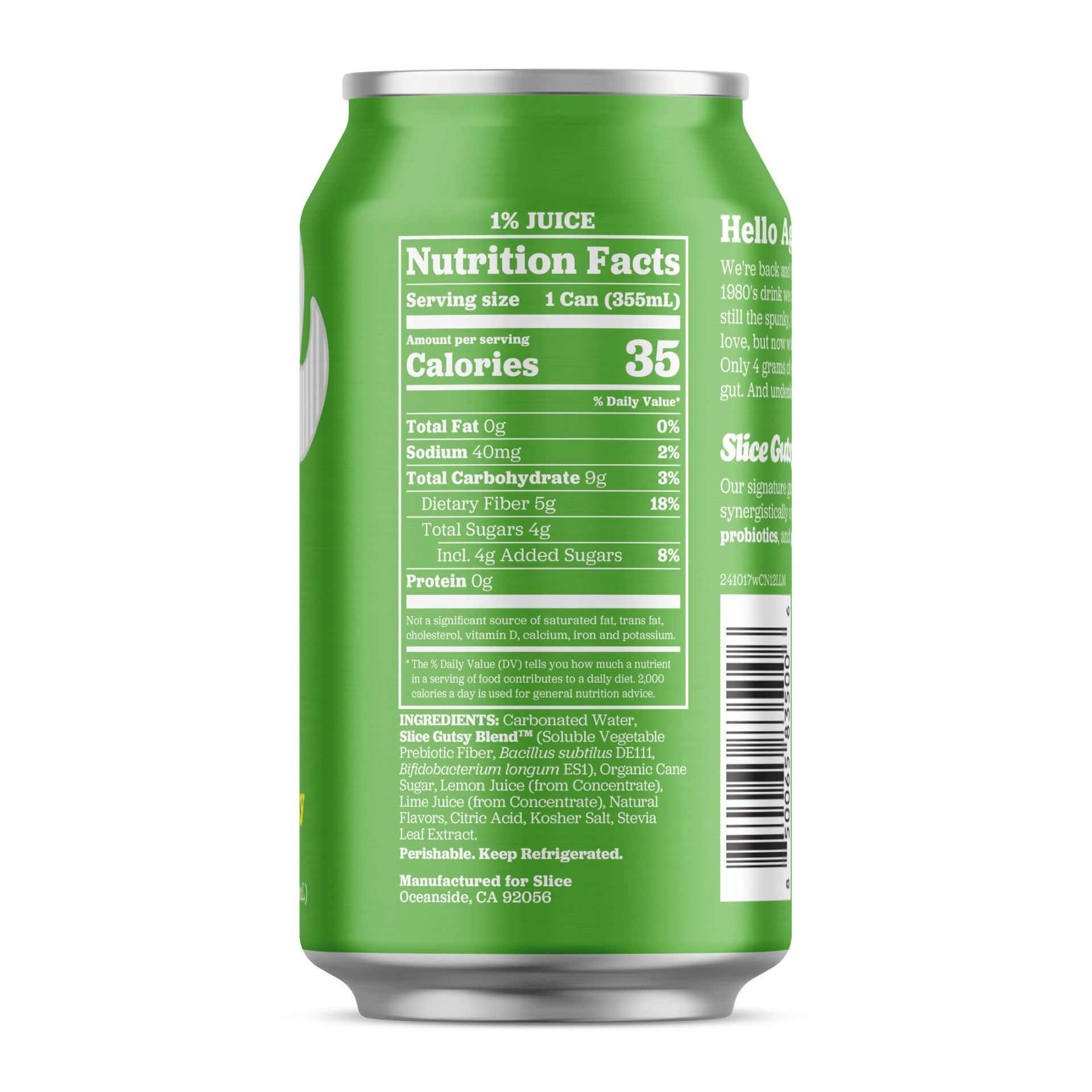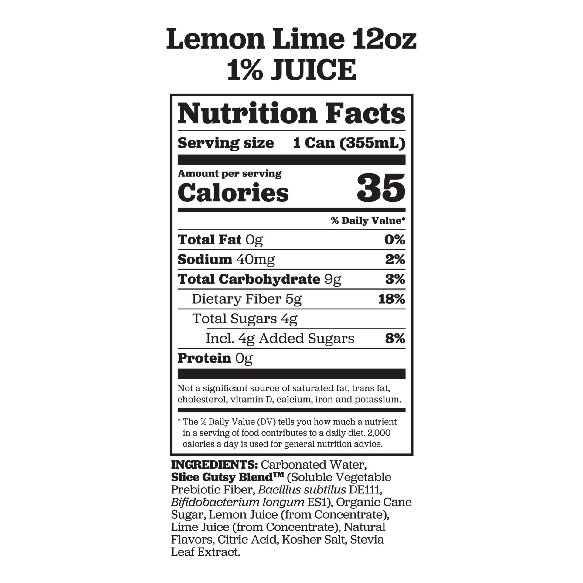 Carbonated Water, Slice Gutsy Blend™ (Soluble Vegetable Prebiotic Fiber, Bacillus subtilus DE111, Bifidobacterium longum ES1), Organic Cane Sugar, Lemon Juice (from Concentrate), Lime Juice (from Conc…