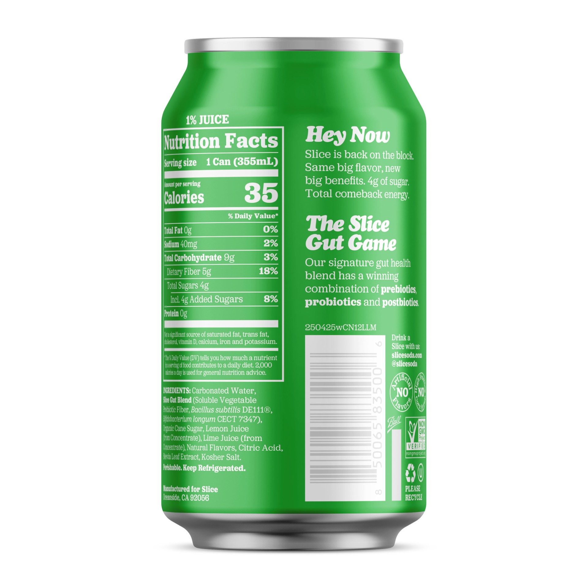 Carbonated Water, Slice Gut Blend (Soluble Vegetable Prebiotic Fiber, Bacillus subtilis DE111, Bifidobacterium longum CECT 7347), Organic Cane Sugar, Lemon Juice (from Concentrate), Lime Juice (from C…