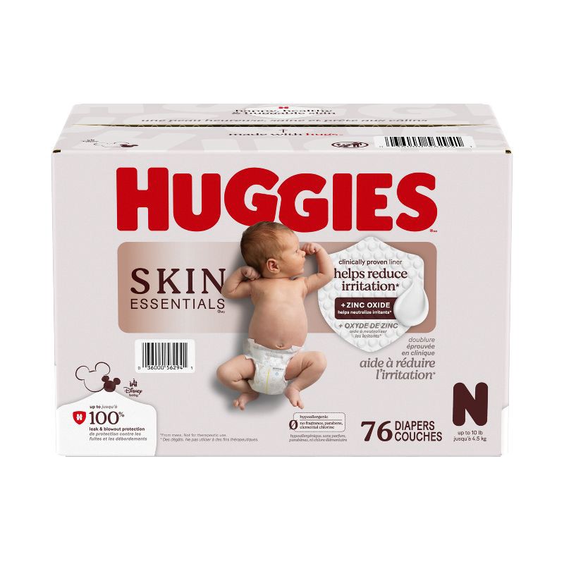 - Huggies Skin Essentials Diapers: 76 Huggies Skin Essentials Baby Diapers, size Newborn (6-9 lbs)