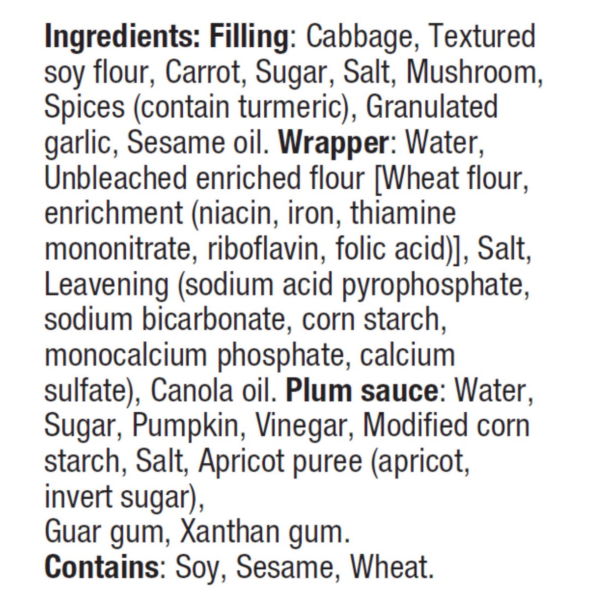 Filling: Cabbage, Textured Soy Flour, Carrot, Sugar, Salt, Mushroom, Spices (Contain Turmeric), Granulated Garlic, Sesame Oil, Wrapper: Water, Unbleached Enriched Flour [Wheat Flour, Enrichment (Niaciā¦