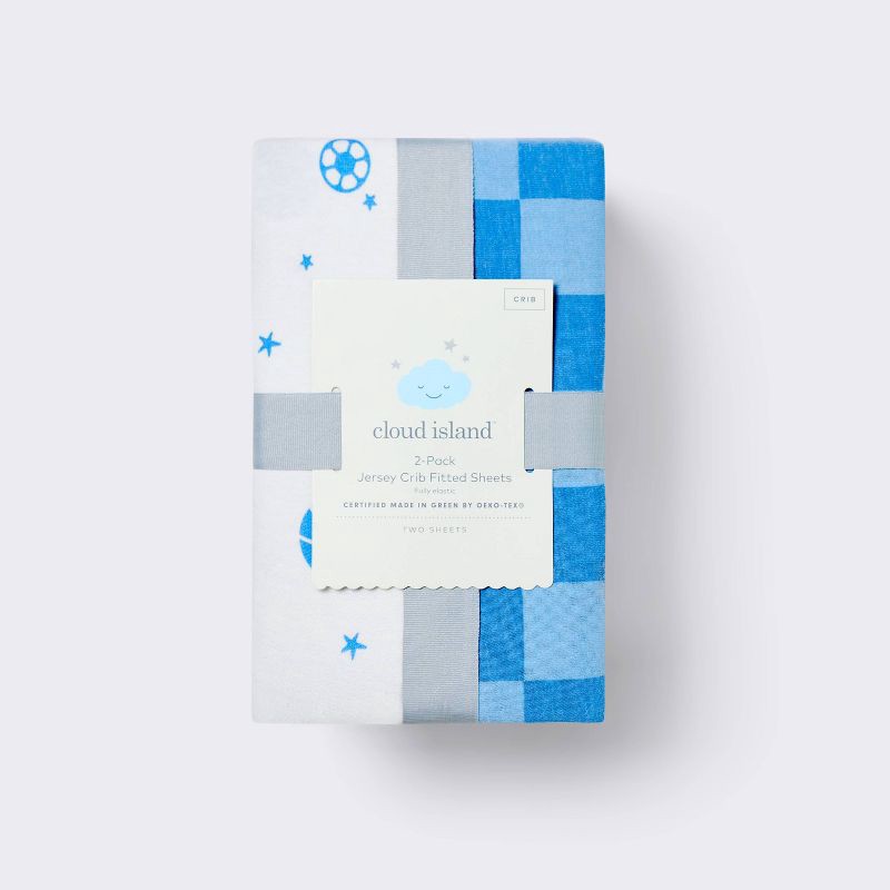 2pk Fitted Jersey Crib Sheets - Sports - Cloud Island™: Standard Crib/Toddler, 6" Depth, 95% Cotton, 5% Spandex