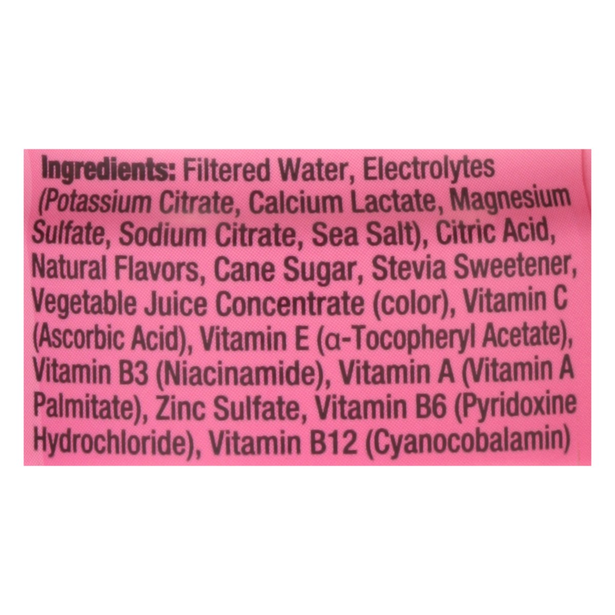 Filtered Water, Electrolytes (Potassium Citrate, Calcium Lactate, Magnesium Sulfate, Sodium Citrate, Sea Salt), Citric Acid, Natural Flavors, Cane Sugar, Stevia Sweetener, Vegetable Juice Concentrate …