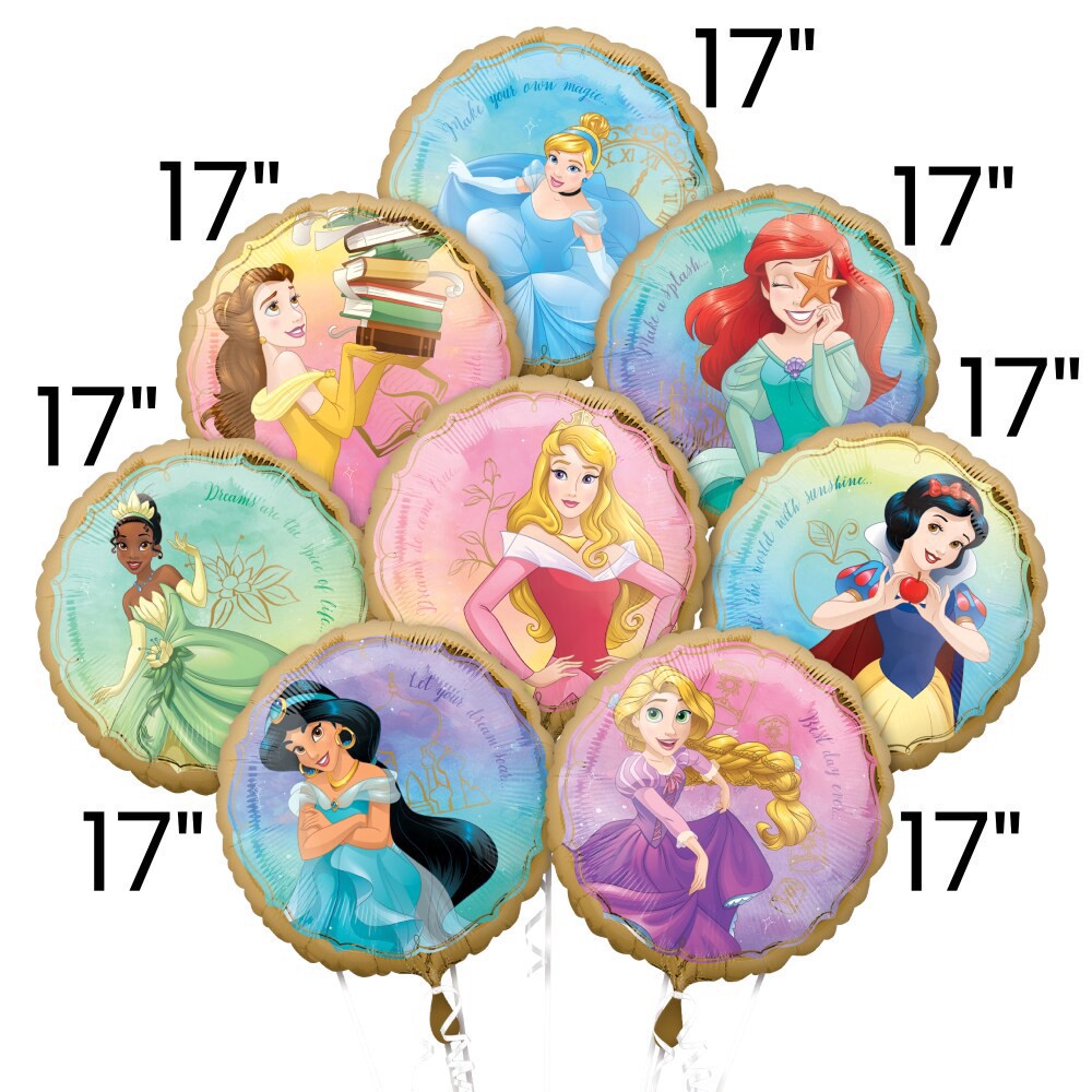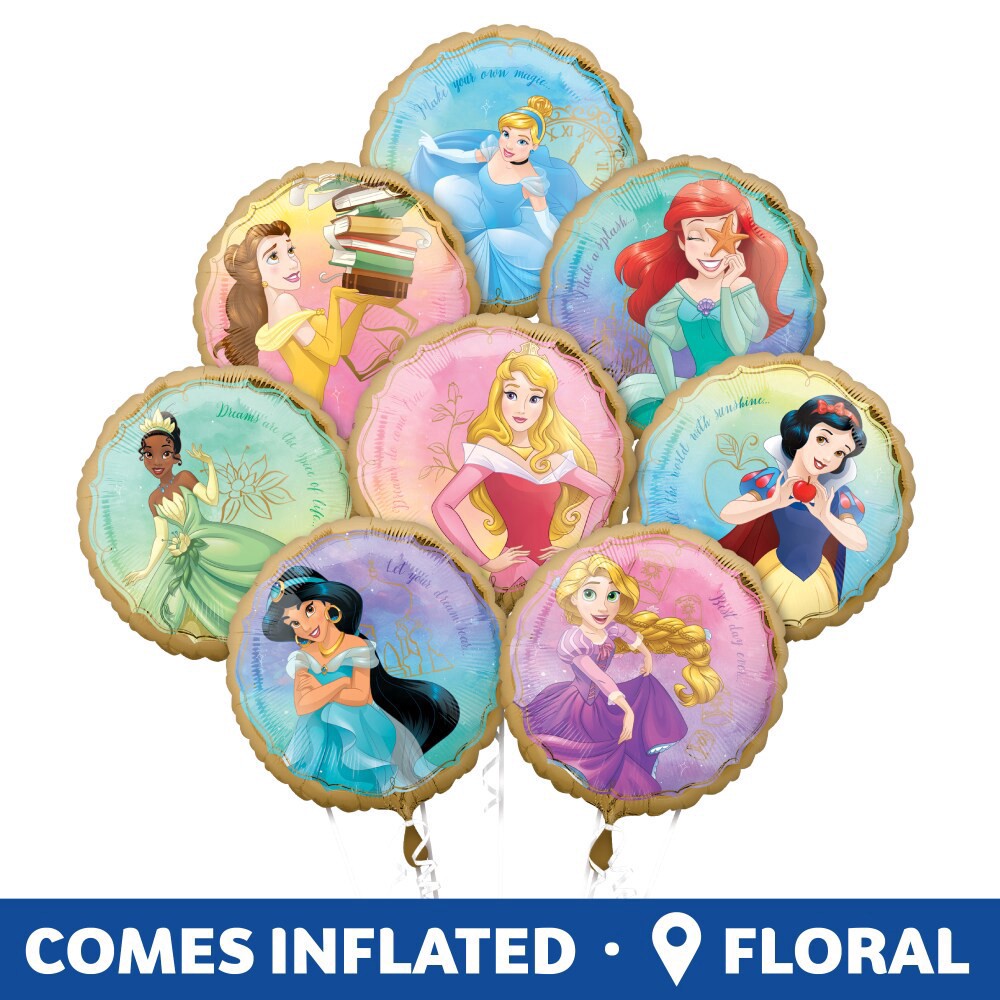 Shower your little princess on her big day with this Disney Princess balloon bouquet. This bouquet features 8 coordinating Disney princess theme standard balloons. Each balloon will have one of the pr…