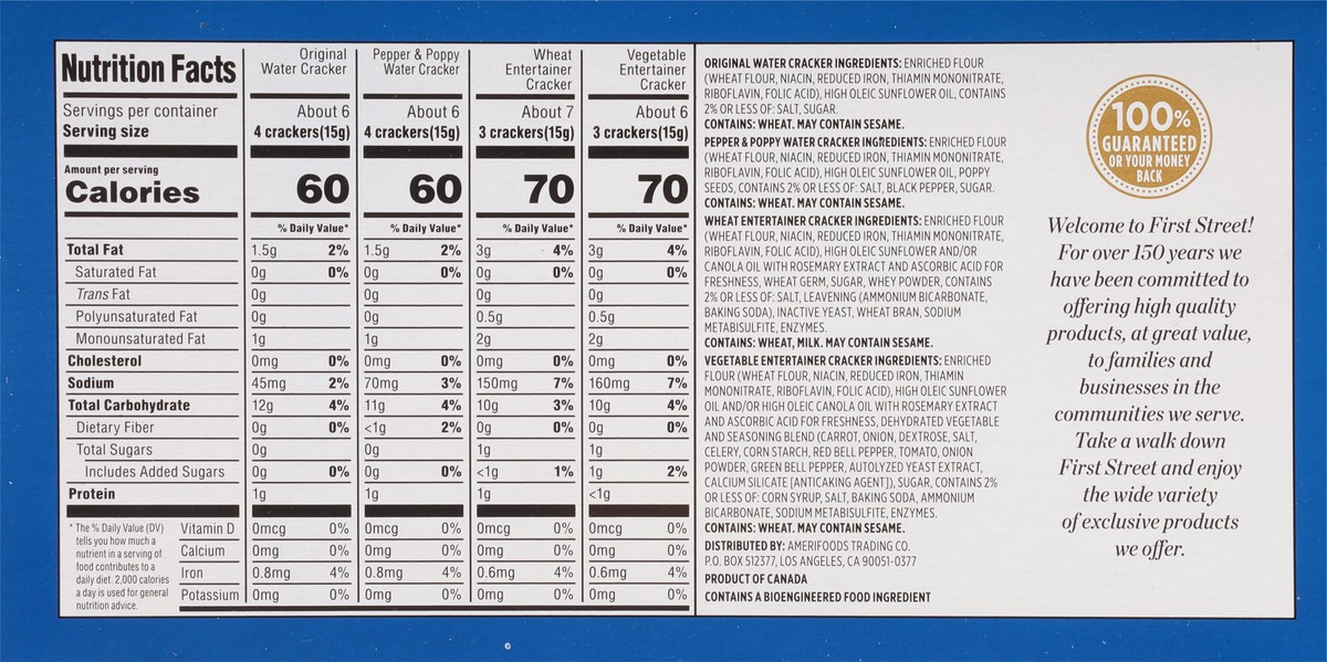 Original Water Cracker: Enriched Flour (Wheat Flour, Niacin, Reduced Iron, Thiamin Mononitrate, Riboflavin, Folic Acid), High Oleic Sunflower Oil, Contains 2% or Less of: Salt, Sugar. Vegetable Entert…