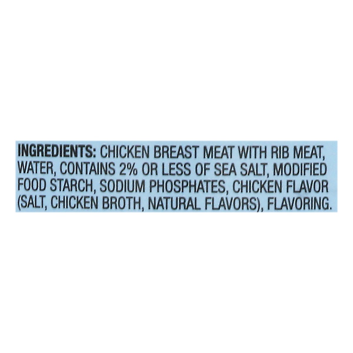 Chicken Breast Meat with Rib Meat, Water, Contains 2% or Less of Sea Salt, Modified Food Starch, Sodium Phosphates, Chicken Flavor (Salt, Chicken Broth, Natural Flavors), Flavoring.