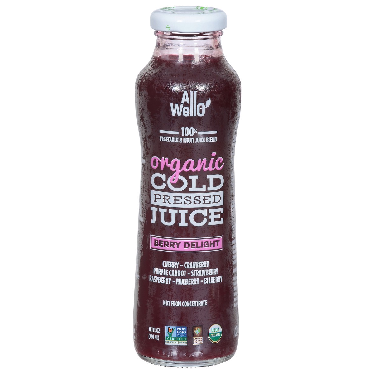 100% vegetable & fruit juice blend. Not from concentrate. Natural separation may occur. 9 cherries; 13 cranberries; 3/5 purple carrot; 10 strawberries; 6 raspberries; 6 mulberries; 8 blueberries. Cert…